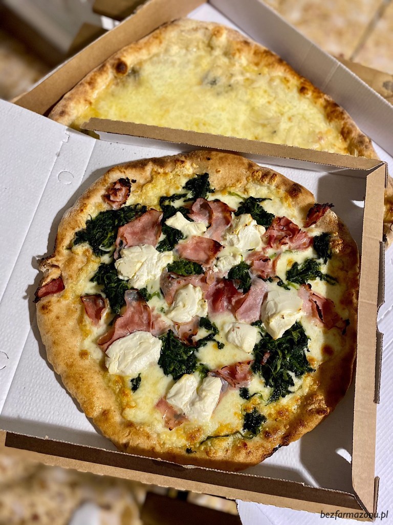 Ta pierwsza oprócz pistacjowej posypki z bazyliowym pesto i wiśniowych pomidorków miała ukrytą w rantach ricottę – ciasto bezglutenowe było okey, ale bez problemu dało się je odróżnić od normalnego. No i ta bezglutenowość nie jest taka pełna, gdyż pizze wypiekane są w tym samym piecu, w którym pieką się placki na standardowej mące.