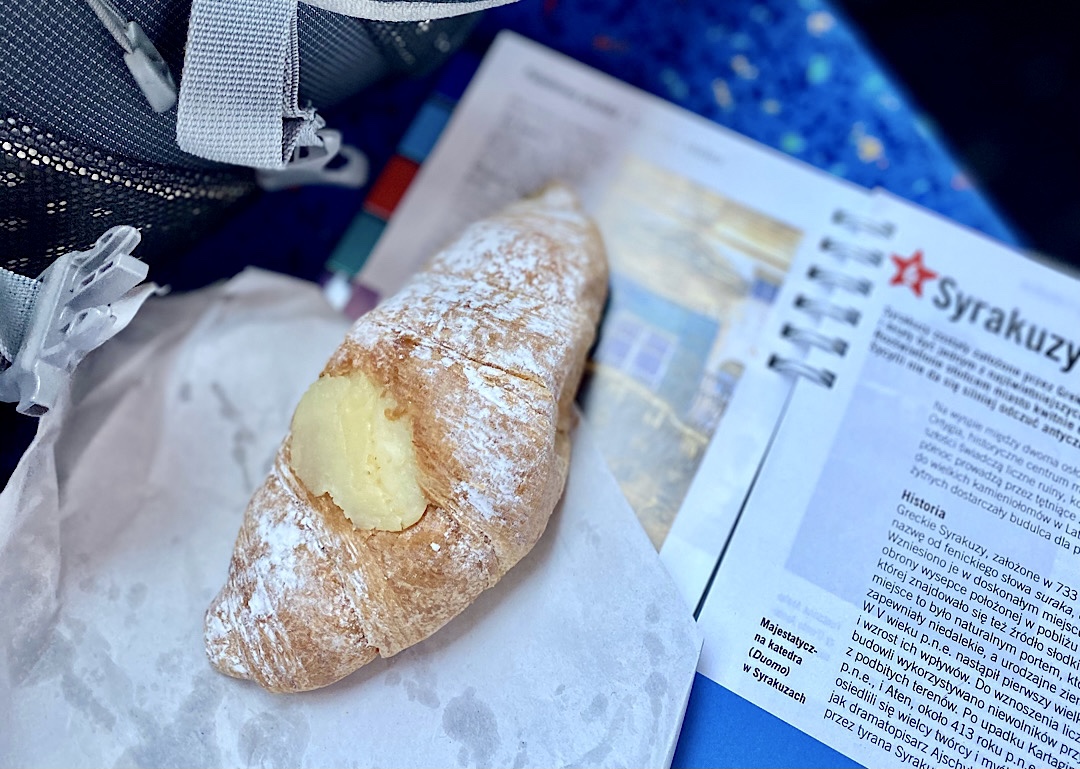 Rogaliki (1,5 Euro) średnie, bo z małą ilością nadzienia. ale wypiek Grande con ricotta (1,7 Euro) ze zdjęcia poniżej, zbliżony do croissanta, jednak nim nie będący, w środku skrywał ricottę. Smakował jak niebo. Jeśli go traficie bierzcie w ciemno!