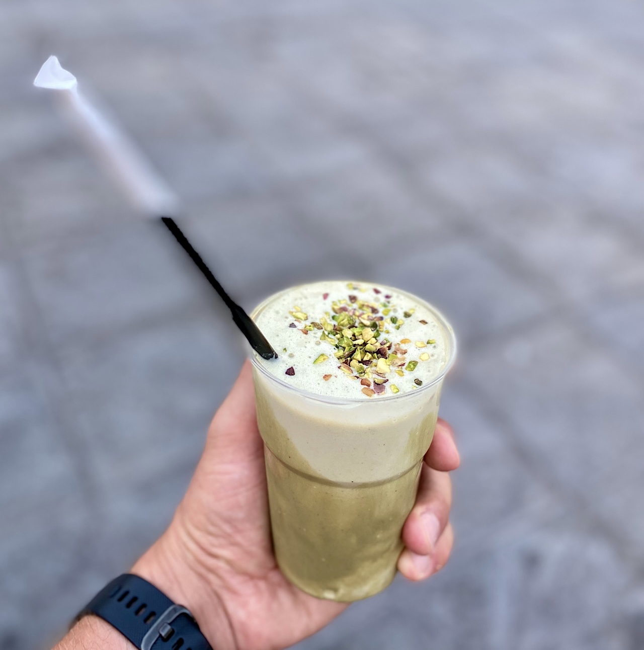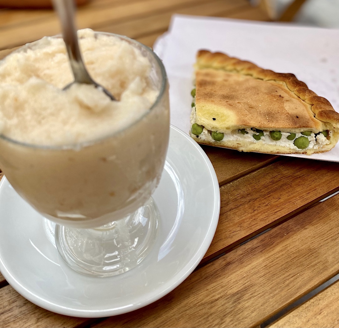 W kiosku na zdjęciu wyżej zjadłem (a może wypiłem?) jeden z najsłodszych w życiu deserów. Pistacjowe Frappe (3 Euro) smakowało jak mieszanka doskonałej jakości zielonych orzechów z mlekiem i co najmniej 5 łyżkami cukru. Do tej pory dziękuję Bogu, że wziąłem małą wersję (piccolo). Mój organizm po takiej dawce węgli niemalże oszalał – nie mam pojęcia jak ktoś mógłby wypić tego więcej niż 200 ml.