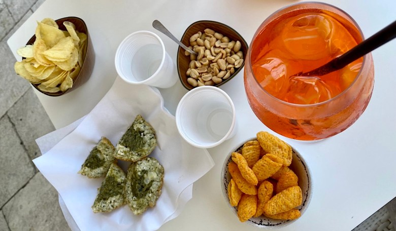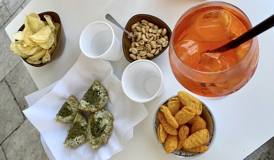 W tym samym ogródku, po długiej wycieczce wjechał rownież Aperol. Turyści chłoną je na potęgę, a te w zależności od lokalizacji i dodatków do nich serwowanych kosztują od 3 do nawet 8 Euro. W tej kawiarni kasują 7 Euro od sztuki, ale zestaw z którym się je podaje również nie należy do małych (plus nie jest pobierane coperto).