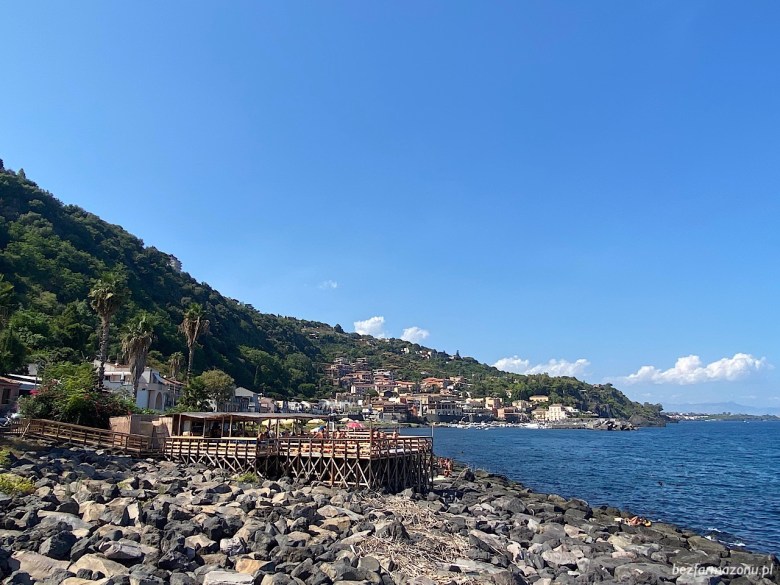 P.S. Do miejscowości Acireale wybraliśmy się, aby docelowo dostać się stamtąd na plażę Santa Maria La Scala (z centrum Acireale kursuje autobus). W miejscu docelowym zbudowano punkt gastronomiczny na balach. Można na nim za darmo rozłożyć ręcznik, a do krystalicznie czystej wody zejść schodkami z pomostu. Na miejscu dostaniecie podstawowe żarełko (nic specjalnego) oraz kubeczek Procecco za dwa eurasy 🙂