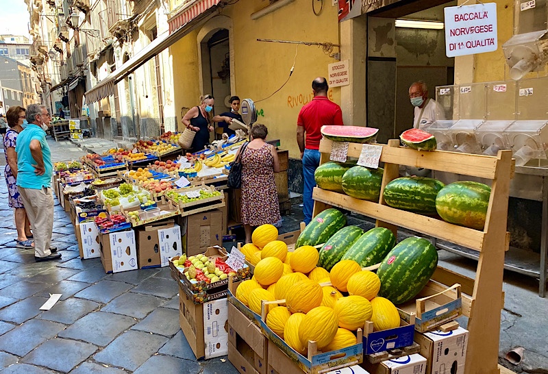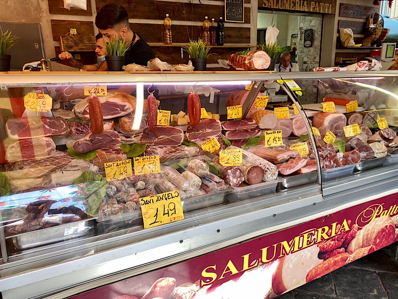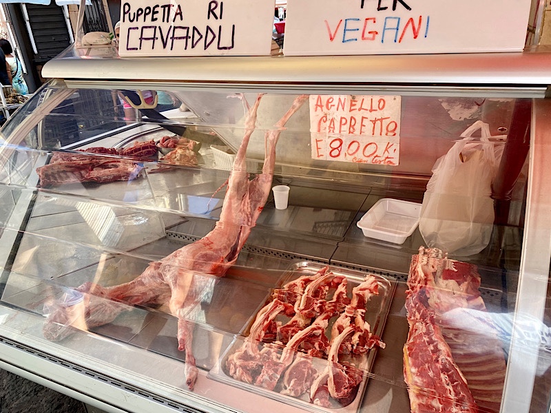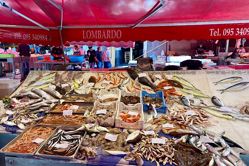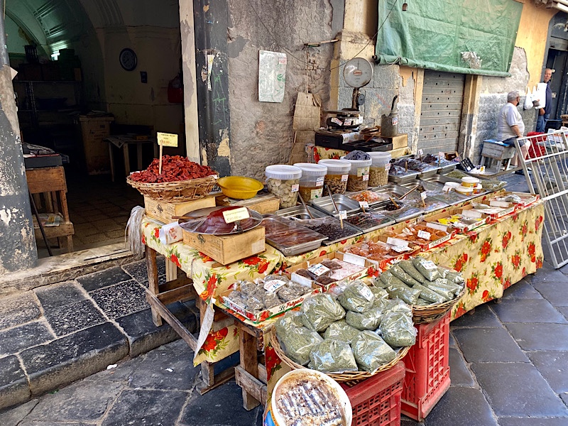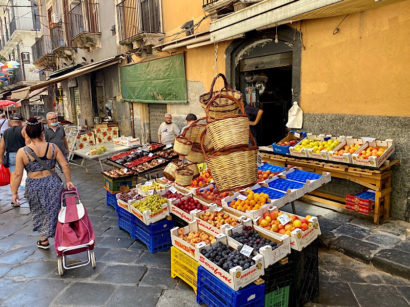 Gro Sycylijczyków zaopatruje się w produkty spożywcze na miejskich targach i bazarach. Jak się postaracie to w każdym większym włoskim mieście takowe wyguglujecie. Jest ich co najmniej kilka w Palermo, a i w Katanii spokojnie je wychwycicie. U garłatych sprzedawców proponuję zaopatrywać się w szynki, sery, warzywa, owoce, orzechy, mięsa i to co pływa w pobliskich wodach. Śniadanie na tarasie wynajętego apartamentu, złożone z takich produktów to mistrzostwo świata.