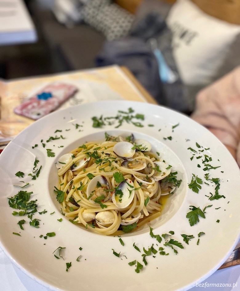 Linguine alle Vongole (48 PLN) to makaron z mąki durum z małżami, oliwą z oliwek, peperoncino, czosnkiem i natką pietruszki. Moim zdaniem potrawa jest zdecydowanie za droga, ale trzeba przyznać że jest to również smaczna pasta.