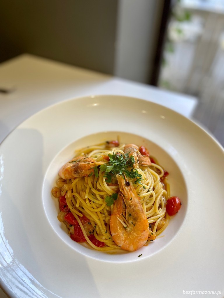 Spaghetti z krewetkami i koktajlowymi pomidorkami (36 PLN) oprócz trzech większych krewet do obrania, zawierało również mnóstwo malutkich koktajlowych. Oczywiście oliwa i pietruszka. Proste i aromatyczne.