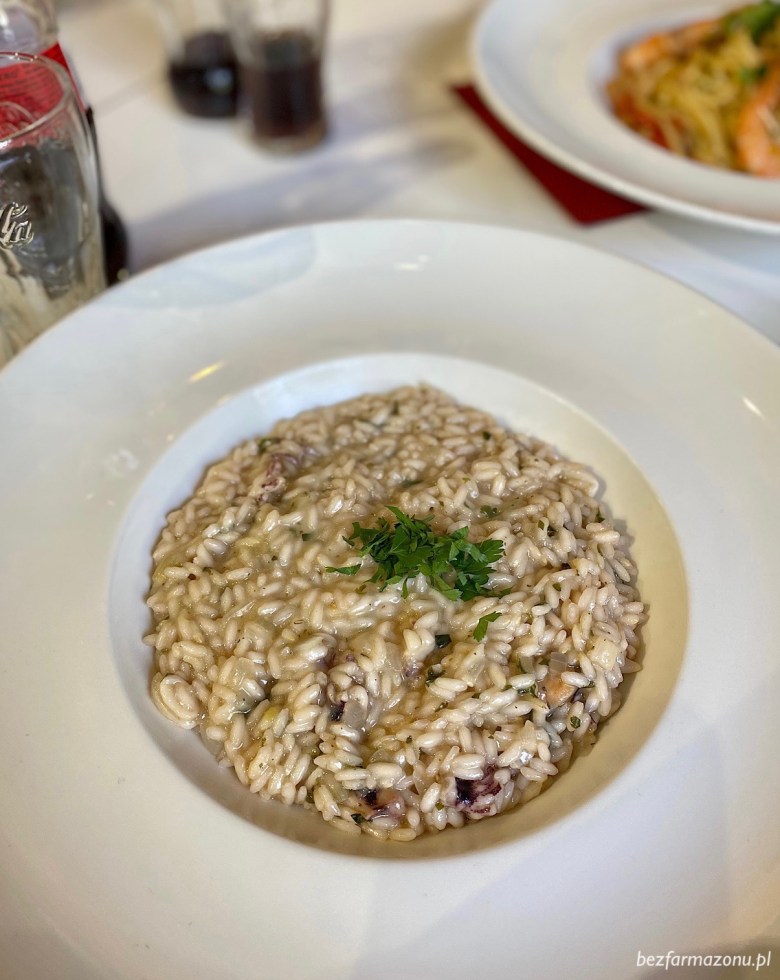 Do risotto, według tego co jest napisane w karcie używa się tylko i wyłącznie oryginalnego włoskiego ryżu Carnaroli (który jest też do kupienia na miejscu). Wersja z owocami morza (36 PLN) smakowała warzywnym wywarem oraz natką pietruszki.