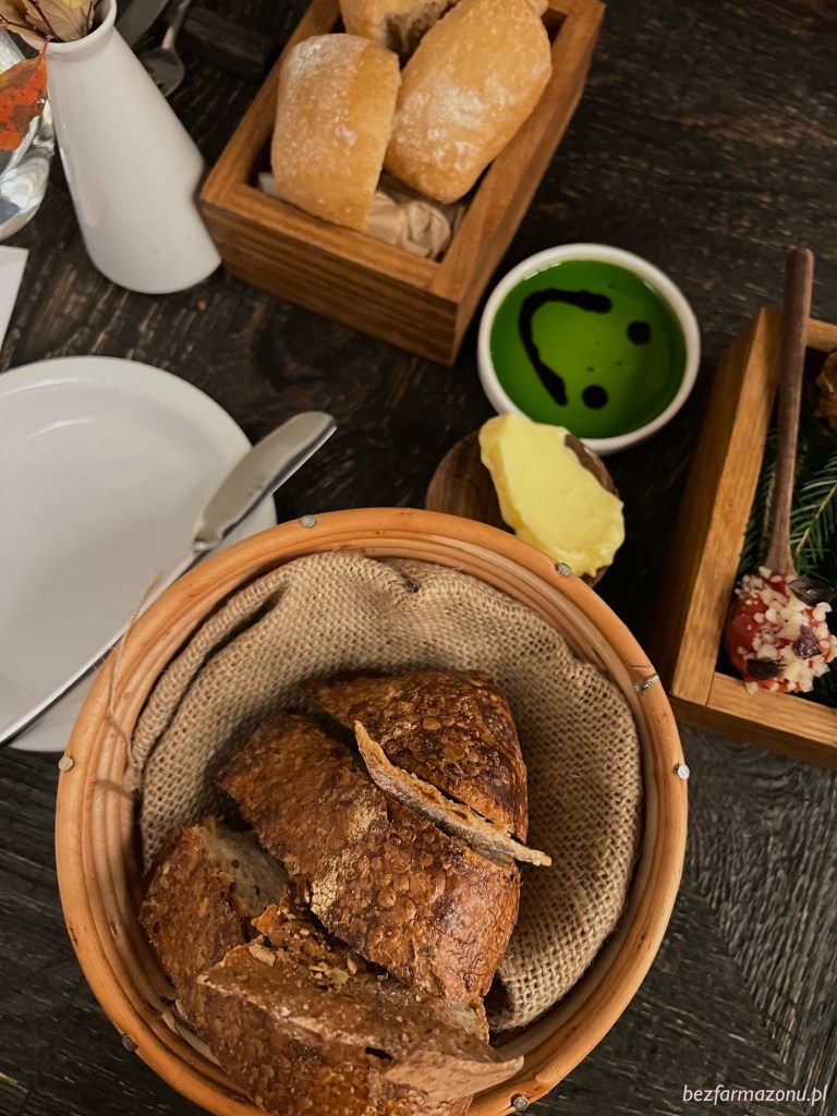 Wypiekany na miejscu CHLEB oraz bezglutenowe bułki / oliwa z TRAWY ŻUBROWEJ / słodka redukcja z brzozy.