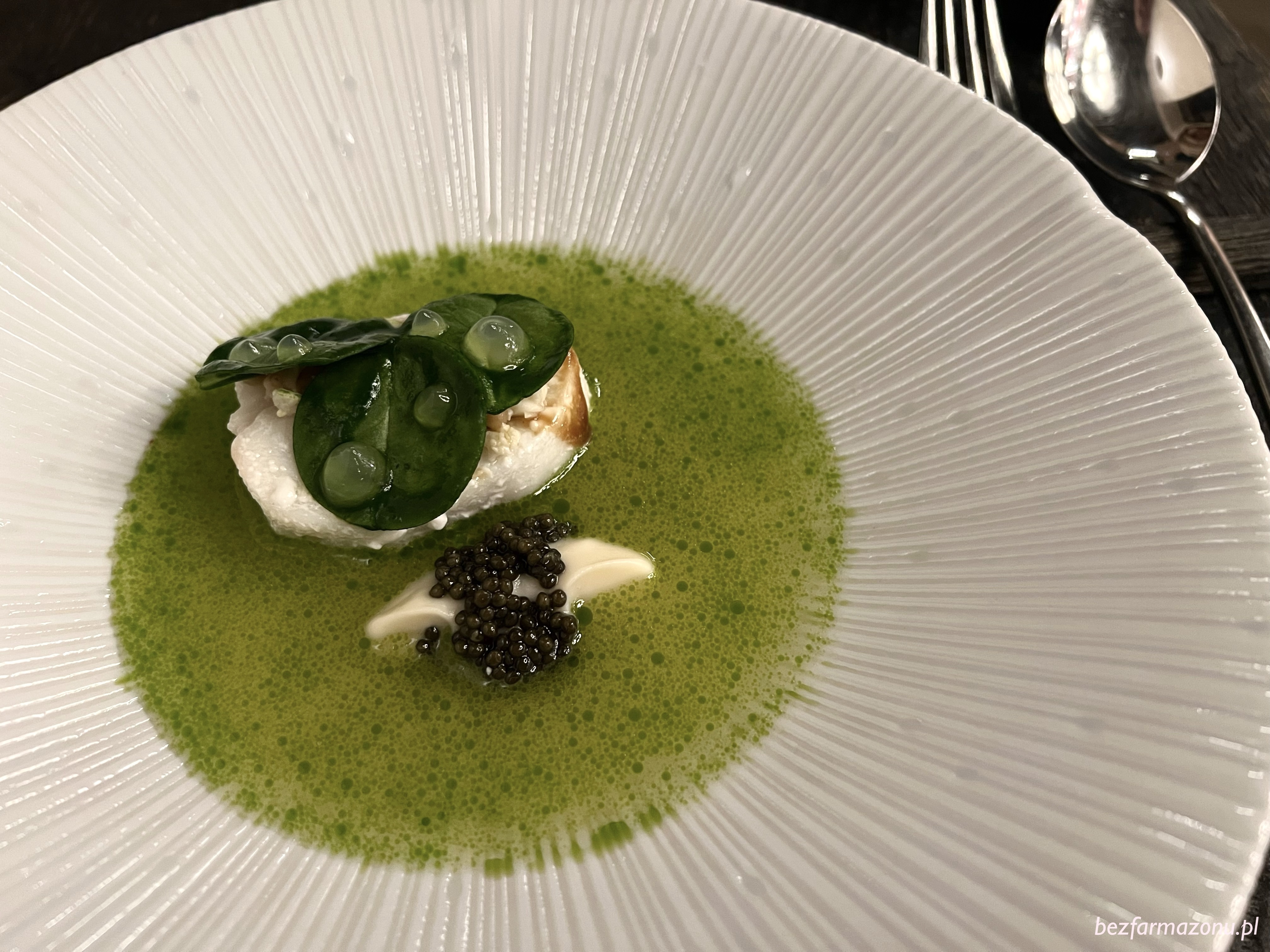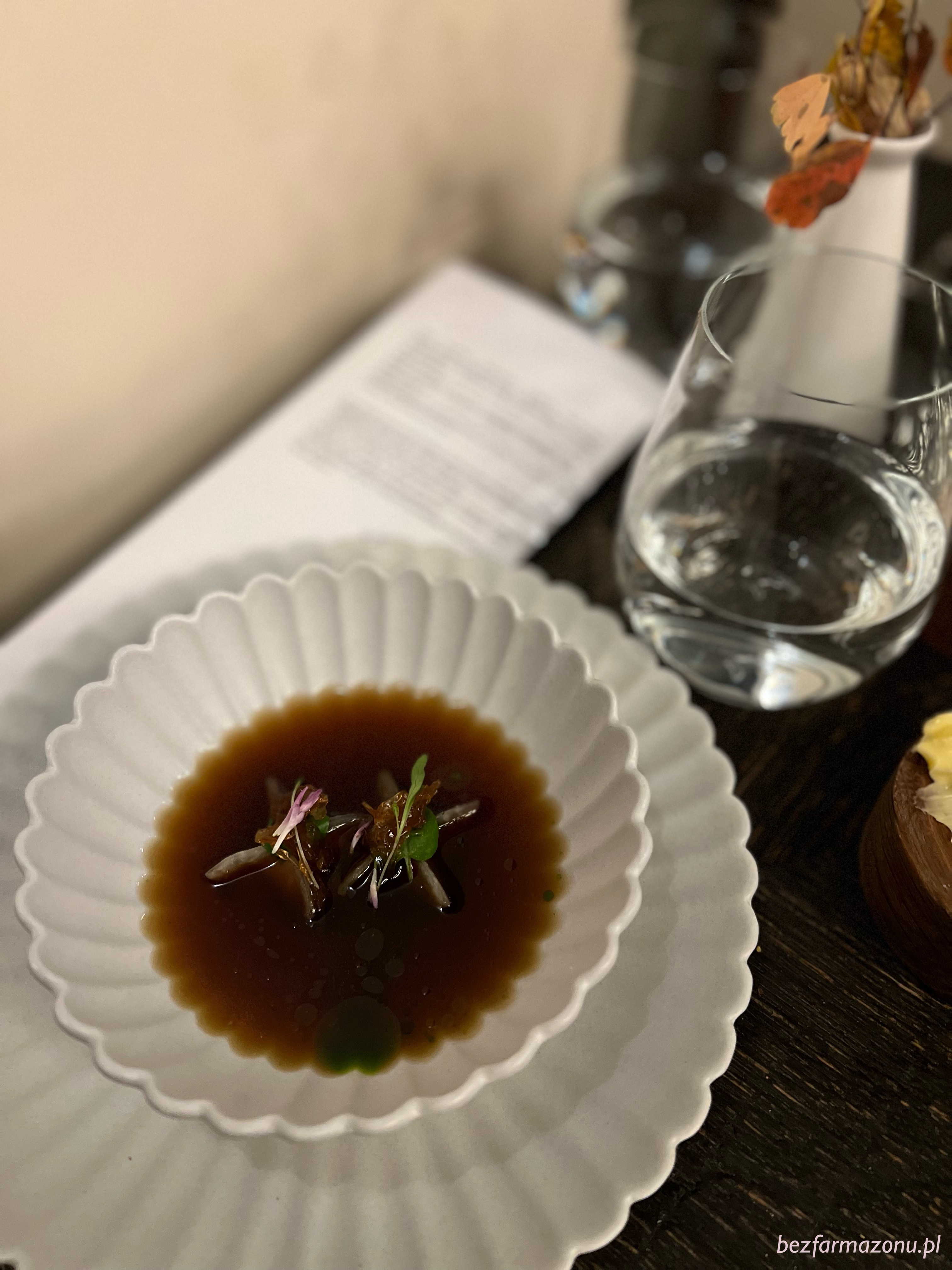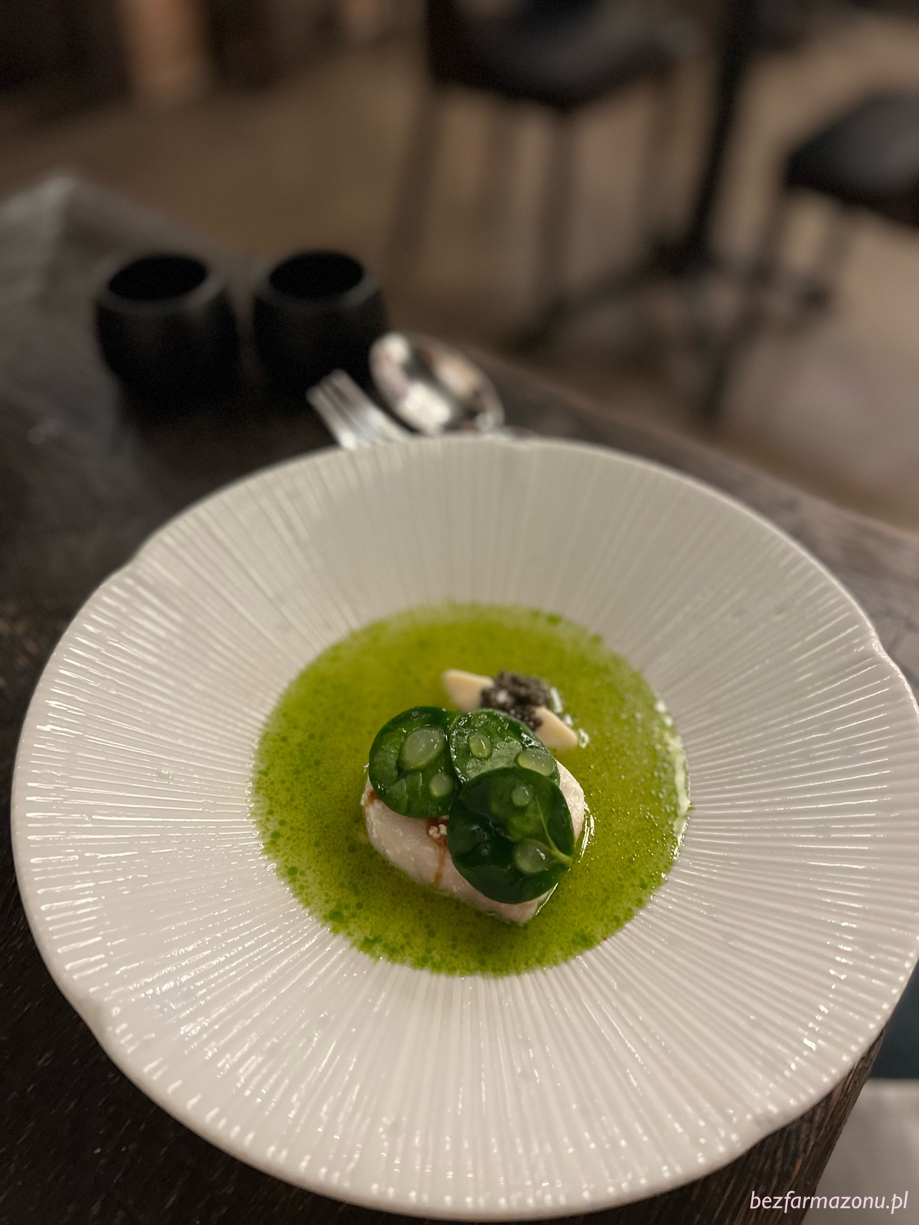 Infuzowany lubczykiem, gotowany 20 godzin BULION z warzyw i palonej kapusty zaskoczył srogą gęstością i intensywnością. Polewka skrywała dwa ułożone na oleju z LIŚCIA LAUROWEGO, sprężyste pierożki z kalarepy z wędzonym WĘGORZEM.