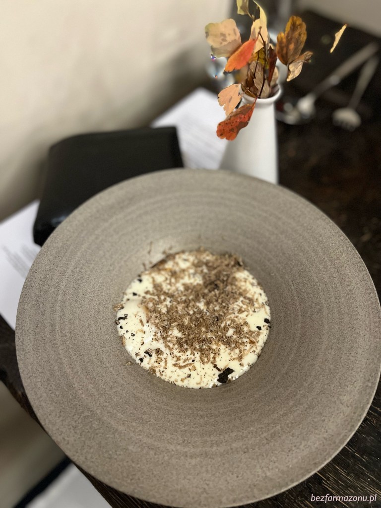 Ostatnia ciepła przystawka rozbiła bank. Polski parmezan Emilgrana produkowany na niepasteryzowanym MLEKU z Wielkopolski w połączeniu z TRUFLAMI i niewidocznymi na zdjęciu pierożkami faszerowanymi ziemniakiem ułożonymi na plastycznej cebuli gotowanej w piwie typu porter. Danie pachniało na kilka metrów i dosłownie tryskało umami. Każdy łyk gęstego sosu i gryz pierożka przenosił pod same bramy kulinarnych niebos. Cudo.