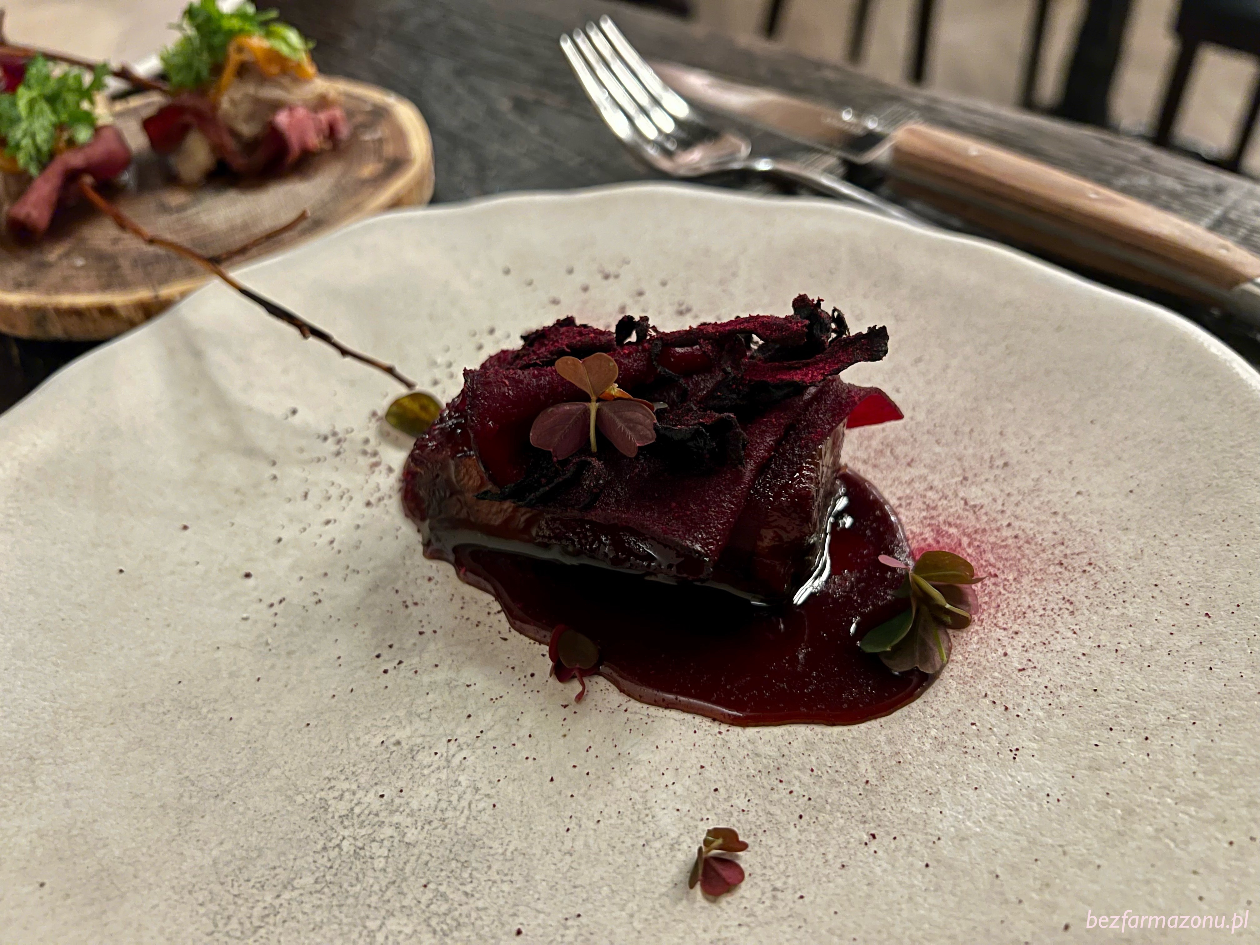 Drugie danie reprezentowało sezonowane dwa tygodnie, długo gotowane arcymiękkie ŻEBRO WOŁOWE. Maleńki kawałek wołowiny spoczywał na puree z czarnego czosnku, a kryły je CZARNE KURKI i piklowany BURAK. Całość wraz z jusem wołowym tworzyła mistrzowski zestaw.