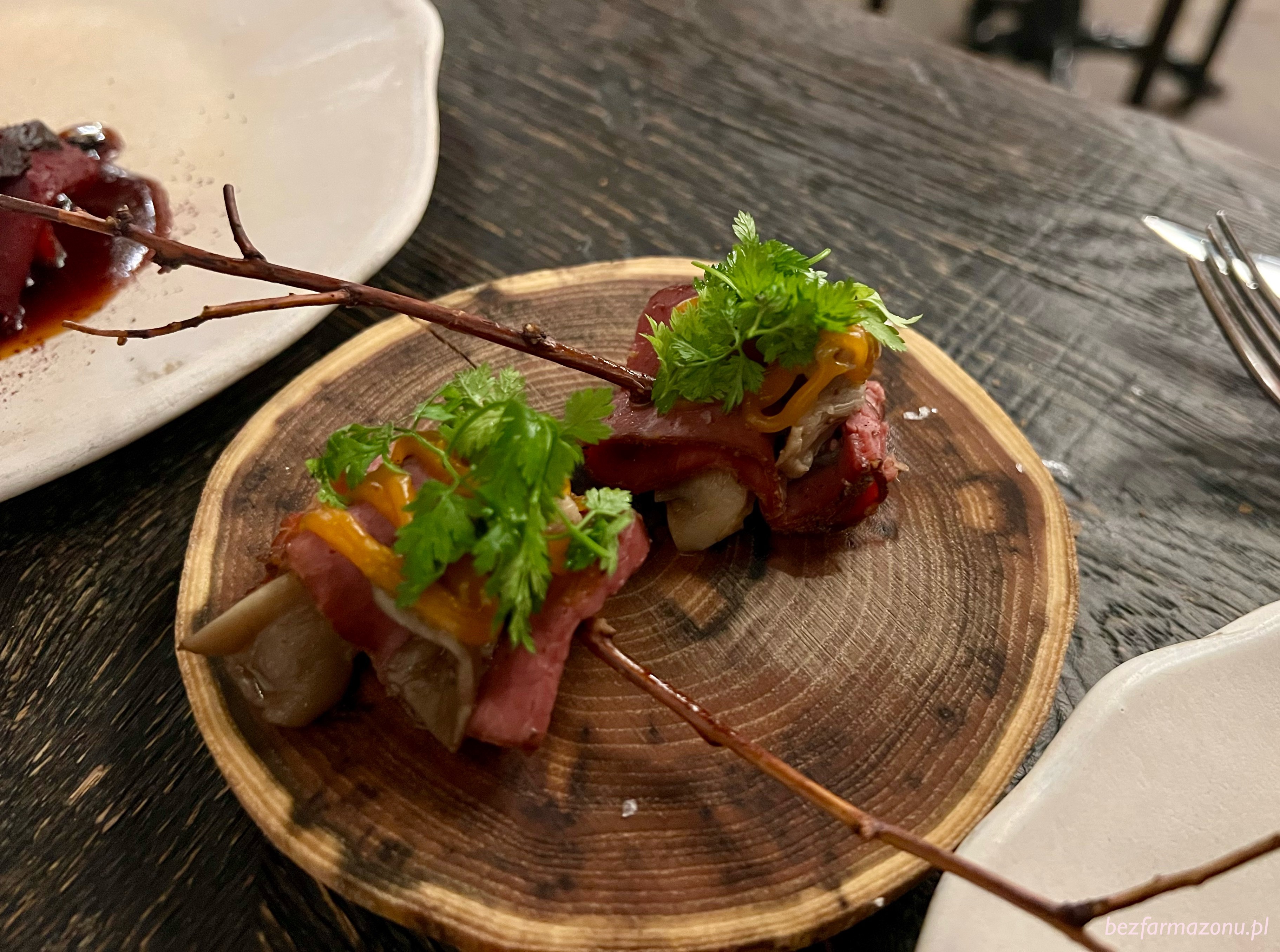 Do wołowiny podano szaszłyki z domowym, aromatycznym pastrami, boczniakiem oraz sosem bbq z moreli.