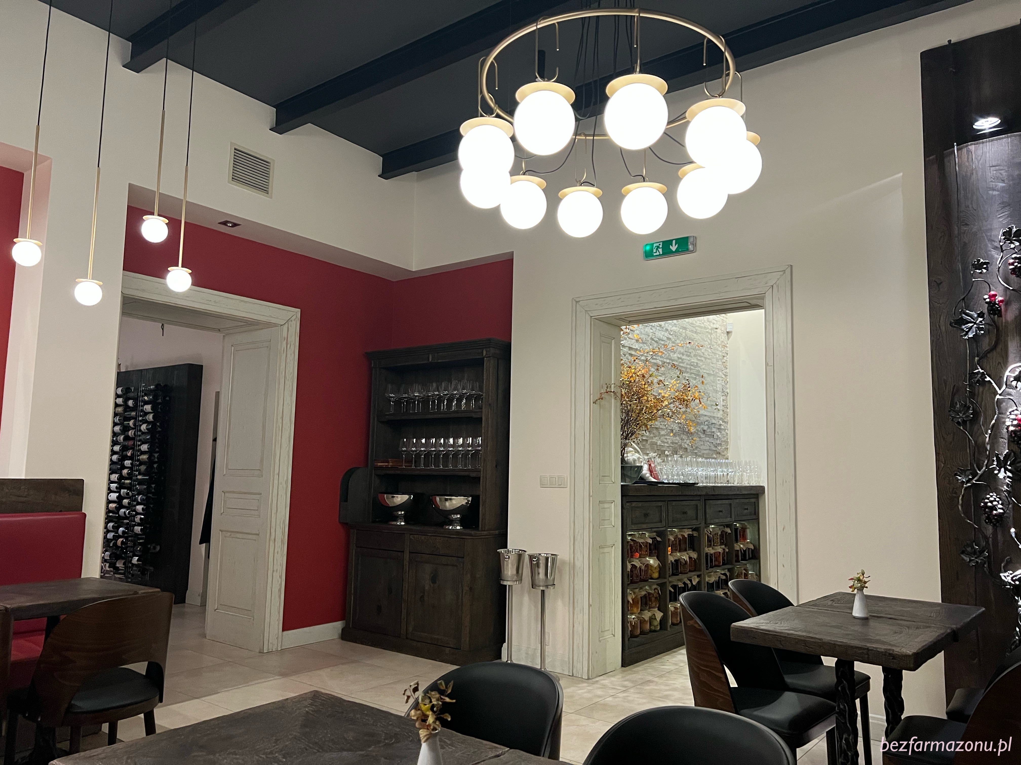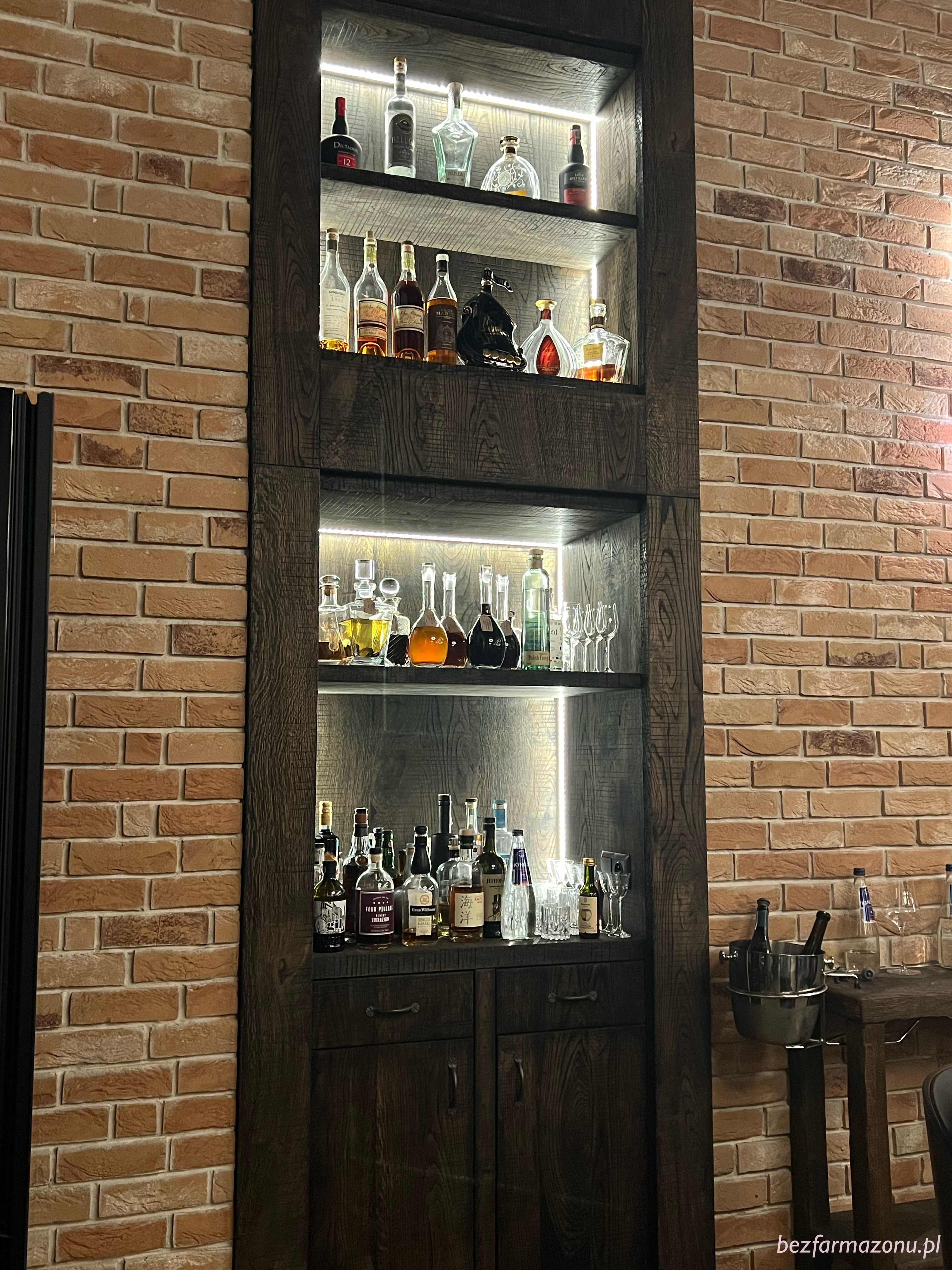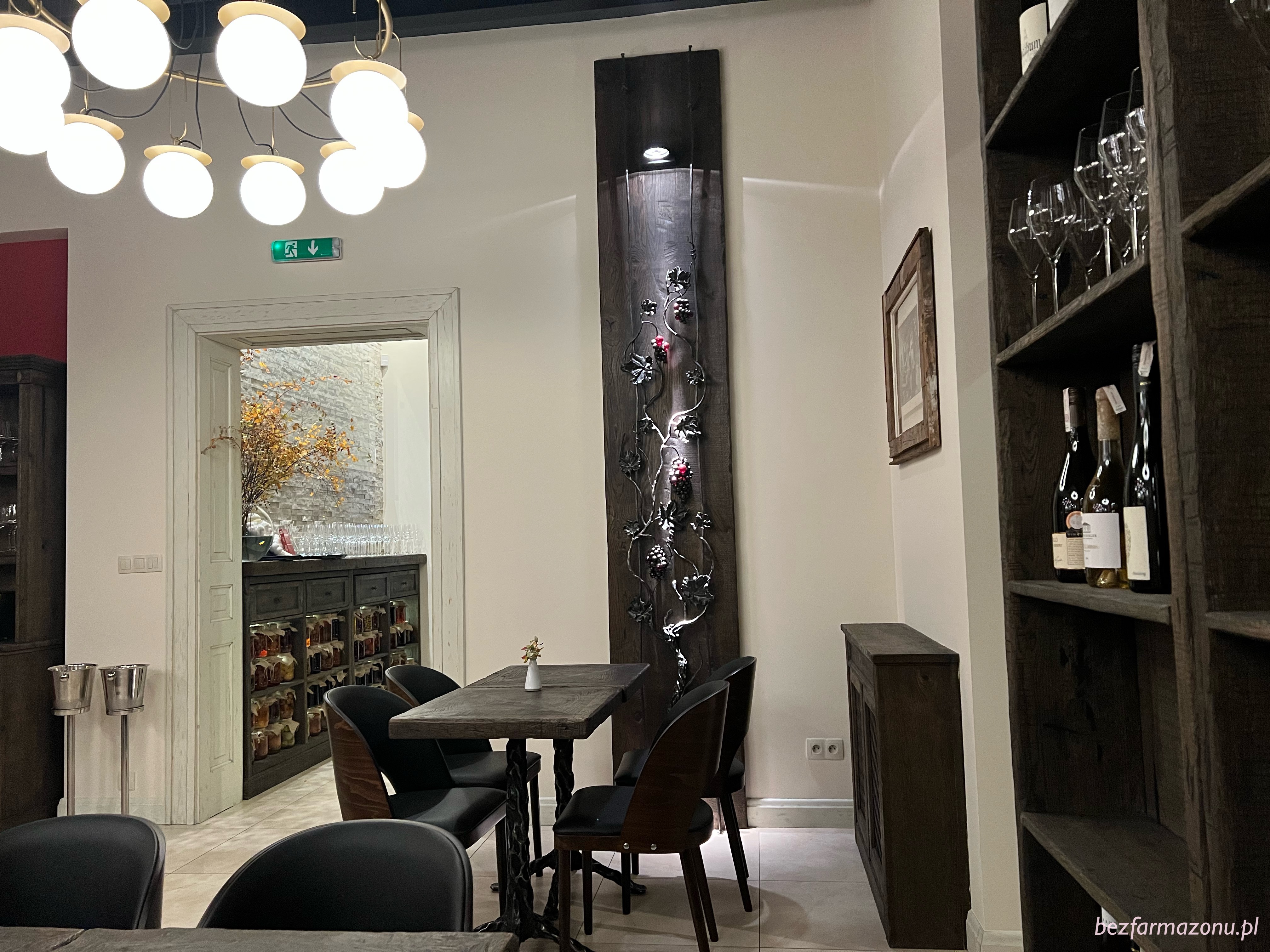 Odrestaurowane wnętrza nie zaskakują i nie powalają designem na kolana. Są luźno – eleganckie, nie krępujące, dobrze oświetlone. Na regałach wyeksponowano wycinek alkoholowej oferty, która ilością oferowanych trunków (kilka stron na tablecie, samych win około 400 etykiet) niejednego przyprawi o zawroty głowy. Co powiecie na 50 ml shot ginu za 8 stówek?