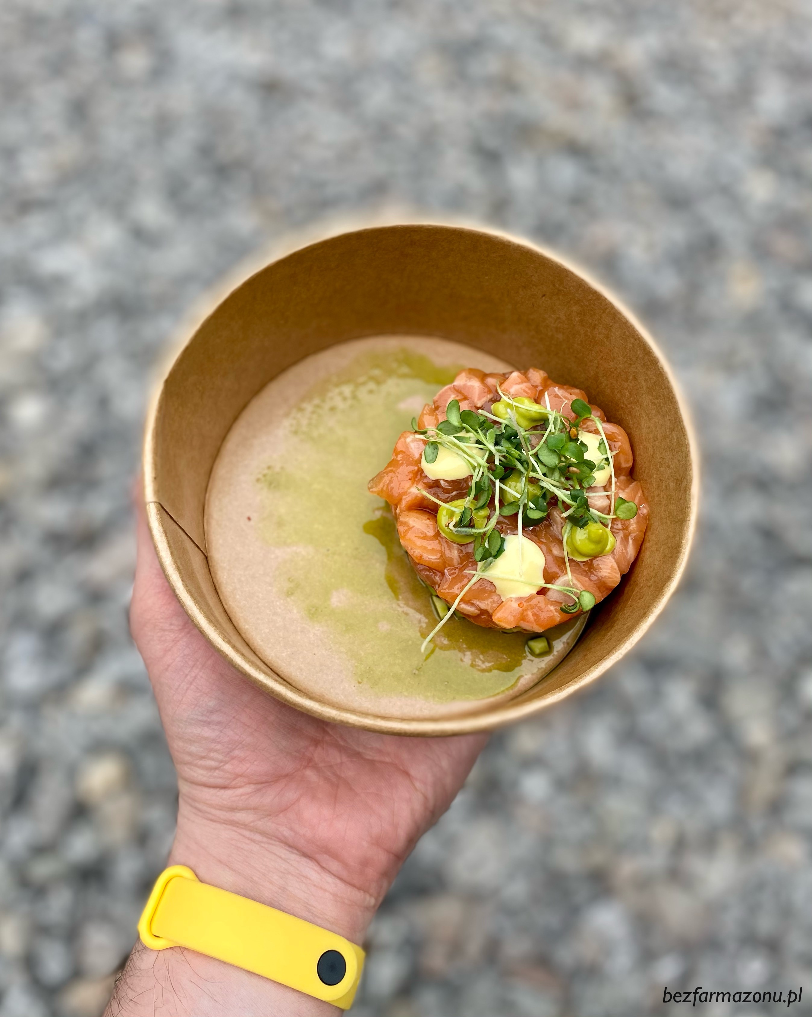 Z obszernego menu na testach wylądował również reprezentujący azjatycką nutę tatar z łososia (32 PLN). 80 gram wybornego mięsa potraktowano oliwą szczypiorkową, sosem sojowym i olejem sezamowym. Pomiędzy kawałkami ryby ukryto drobno siekane kawałki awokado. Japońska przyprawa Togarashi nakręcała pikantność i dodawała kwaskowatości co by nie było zbyt błogo i delikatnie. Plamki majonezu wasabi delikatnie szczypały w język, a majo szafranowo – marakujowego próbowałem pierwszy raz w życiu, więc ciężko o rzeczową opinię.