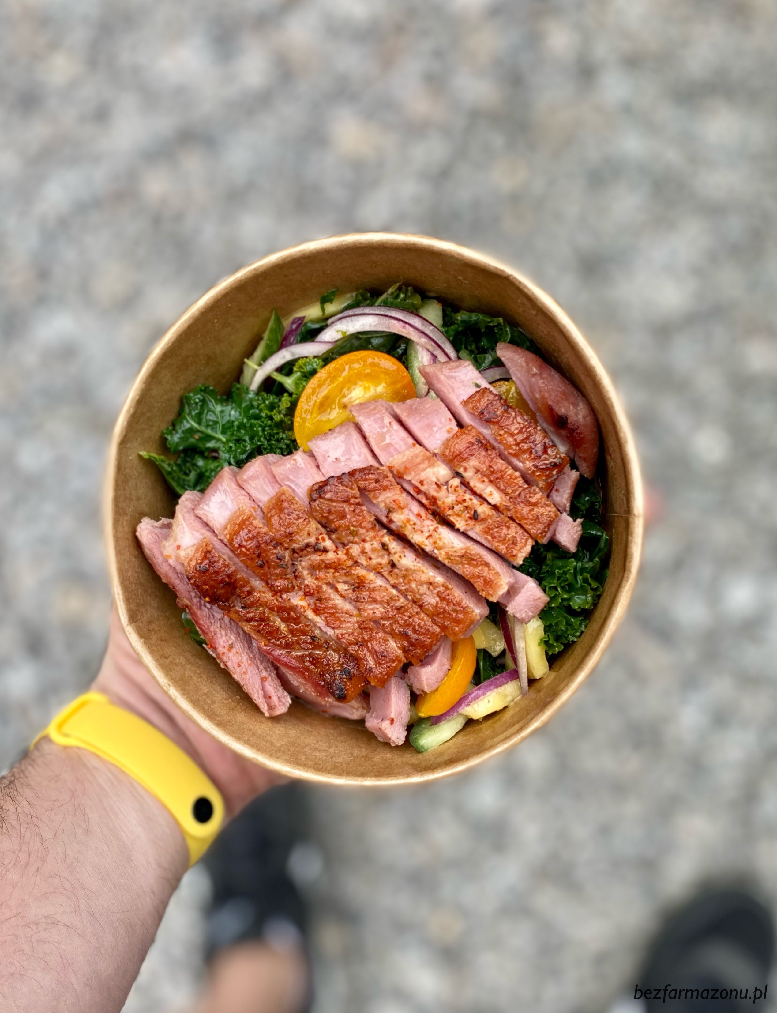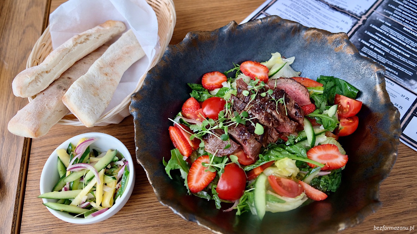 Sałata (szpinak baby, rukola, lodowa) ze świecą wołową, koktajlowymi pomidorkami i truskawkami w towarzystwie domowych pszennych paluchów (27 PLN) to świetny wybór dla trzymających linię. W tej wersji jest bardzo dużo mięsa, a tym samym łatwo przyswajalnych odzwierzęcych protein. Świeca to znane również jako steka rzeźnika cięcie z przepony – ma wyjątkowy smak i delikatność zbliżoną do polędwicy. W misce znajduje się również papryka, zielony ogórek i czerwona cebula. Całość bazuje na odrobinę słodkim vinaigrette. Bardzo okey.