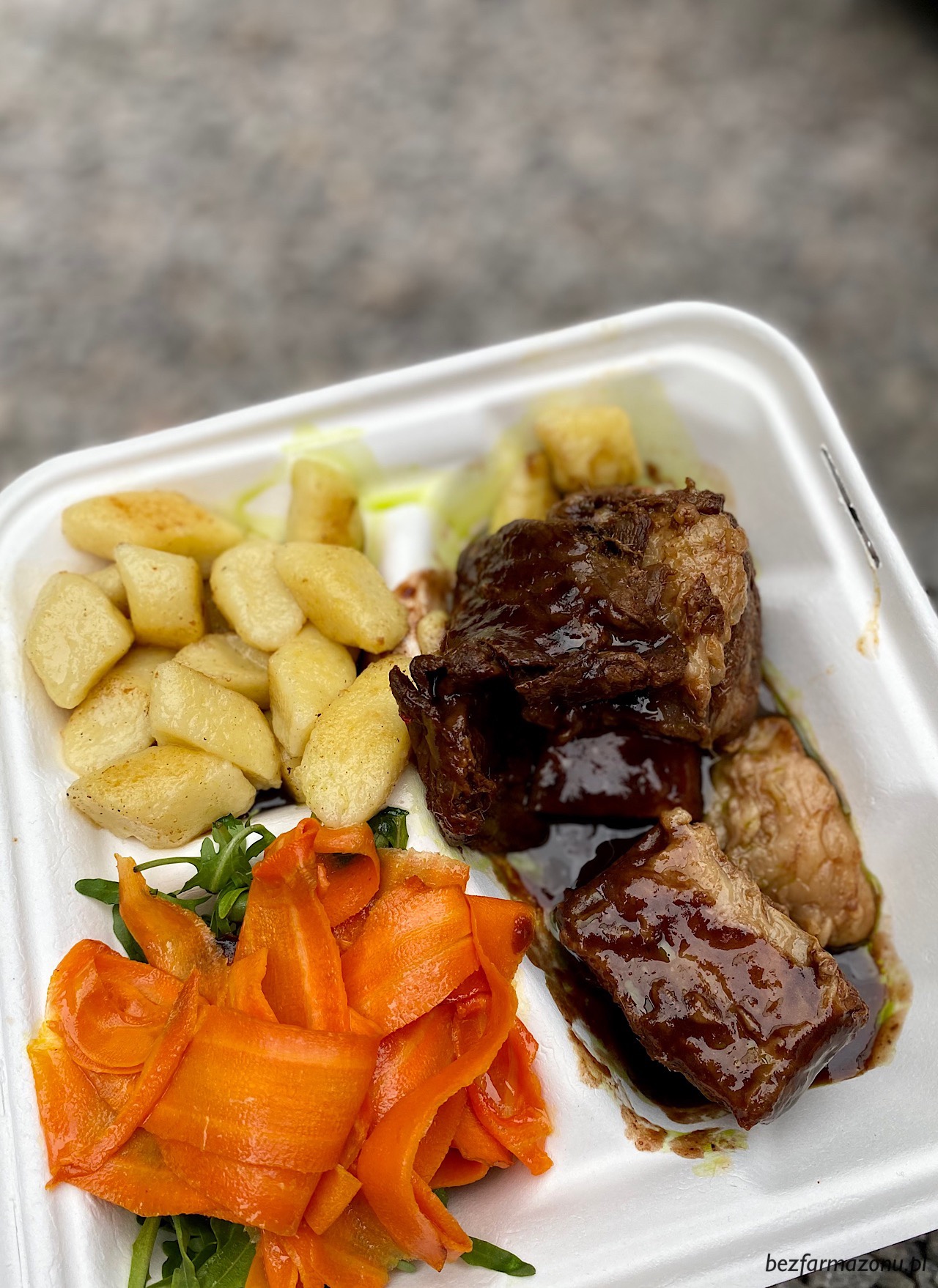 Kolejne danie główne w menu widnieje jako żebro wieprzowe bbq (39 PLN), lecz z racji wielkości powinno być nazwane żebruniem. Mięso przygotowano perfekcyjnie – za dotknięciem widelca odchodziło od dwóch kostek – wraz z tłuczonymi orzechami laskowymi i peperoni przywodziło na myśl Azję. Na zębach chrupała prażona cebula, a tej przeciwstawiała się biała kapusta (ta sama co przy ośmiornicy) i dymny, domowy sos bbq. Węglowodany w formie pieczonych w ognisku ziemniaków zamieniłem na ich smażone ćwiartki.