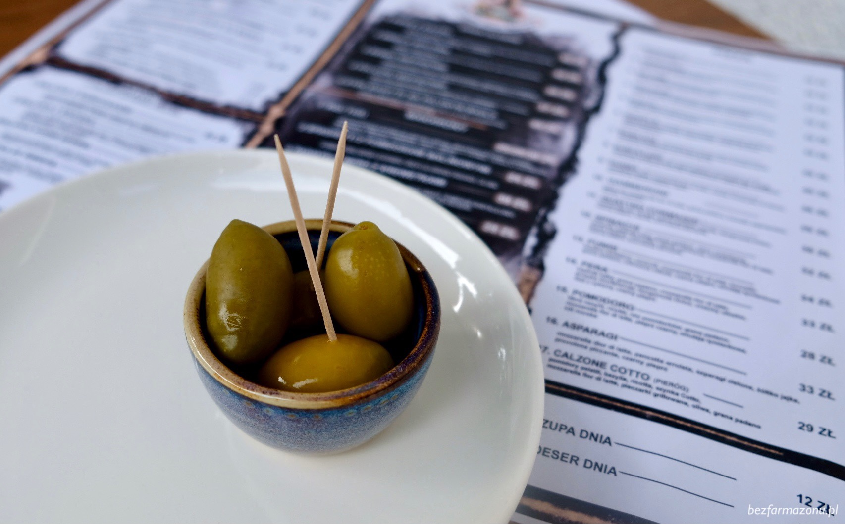 … dostaliśmy w ramach czekadełka cztery wielkie zielone oliwki – prawdopodobnie Bella di Cerigniola.