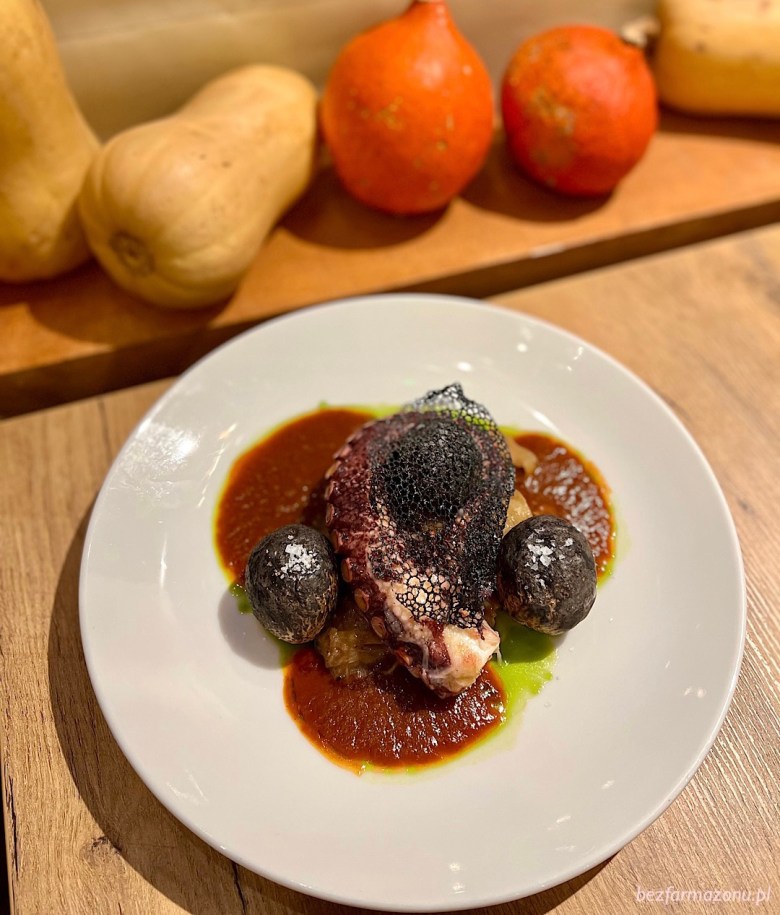 Po drugiej stronie stołu, na domowym hummusie spoczywała pieczona dynia (24 PLN). Anturaż w postaci pesto z suszonych pomidorów i słonecznika, kiszonej cytryny oraz miętowej oliwy śpiewająco wydobywał głębię tego wegańskiego zestawu.