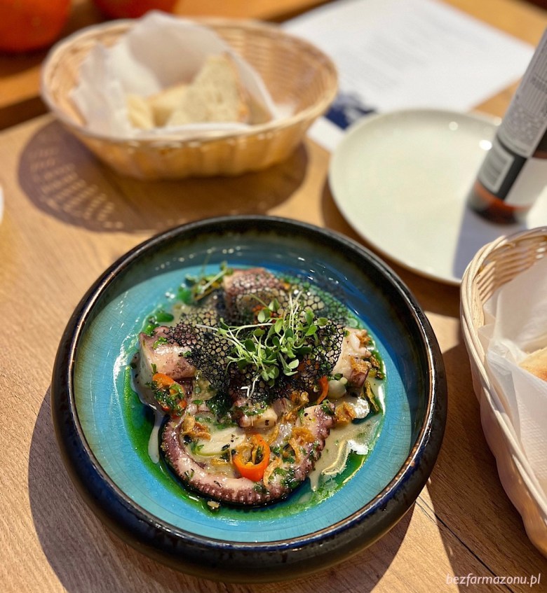 Pierwszą przystawką była miękka, marynowana ośmiornica (29 PLN) w towarzystwie czosnku i sporej ilości masła oraz ziół prowansalskich. Na języku pogrywały chili oraz prażona cebula. Całość skąpana oliwą i emulsją tymiankową. Rarytasowy starter!