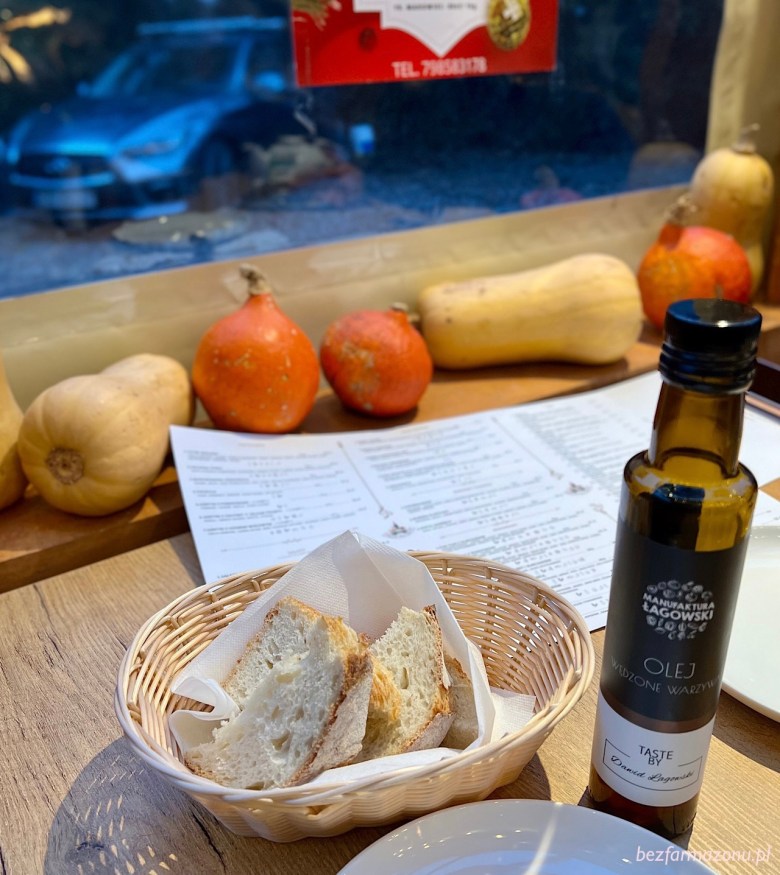 Z obszernej, niesztampowej karty poprosiliśmy o dwie przystawki oraz tyle samo dań głównych. Chwilę później uprzejma kelnerka przyniosła wypiekane na miejscu świeże pieczywo – UWAGA nie z oliwą, lecz naturalnym olejem rzepakowym z wędzonymi warzywami.