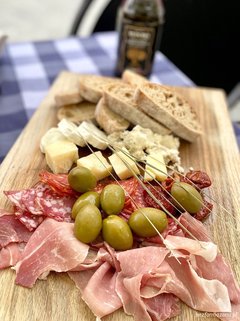 Zaczęliśmy od atipasti. Talerz włoskich specjałów (56 PLN) to ogromna drewniana decha zawierająca: ser kozi dojrzewający, Grana Padano, gorgonzola picante, salami spianata picante, salami Napoli, szynkę dojrzewającą, oliwki i suszone pomidory. Tymi włoskimi specyfikami dobrze pojedzą dwie osoby, ale nawet i cztery bez problemu skosztują wszystkich wymienionych składników.