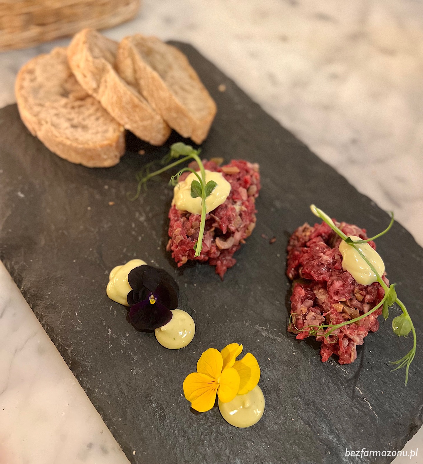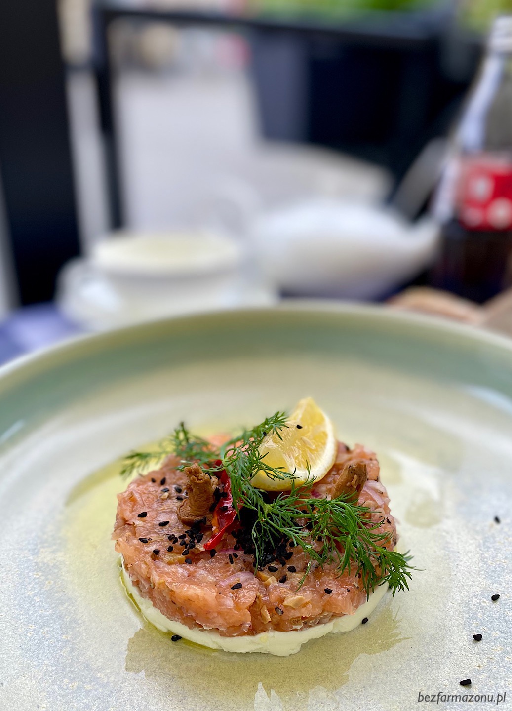 Tatar z łososia (42 PLN) zaskoczył podstawą z kremowego serka. Tak! Da się przygotować „rybny befsztyk” bez użycia majonezu. Oprócz nabiału serwuje się do niego marynowane kurki, szalotkę, koperek, czarnuszkę i kilka kromek pieczywa. Bardzo delikatna i smakowita przystawka. Polecam.