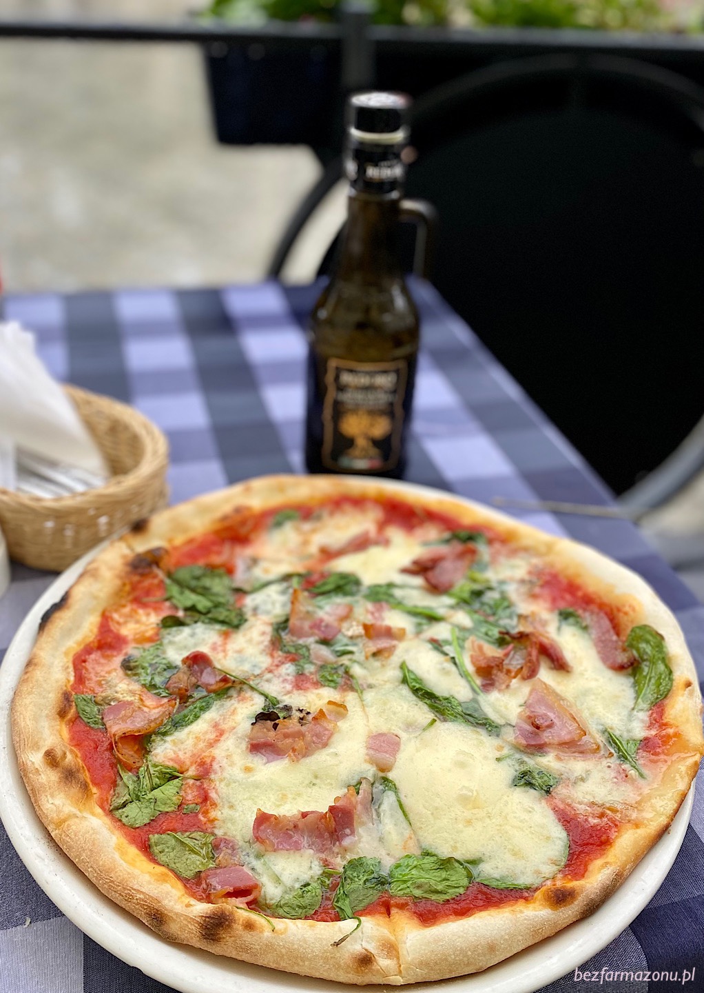 Dookoła widziałem konsumowane z szerokimi uśmiechami pizze, a ja placki lubię, a jakże! Postawiłem na opcję z mozzarellą fior di latte, szpinakiem baby, wędzonym boczkiem, pikantną gorgonzolą oraz czosnkiem (36 PLN). Otrzymałem super cienką, zdecydowanie nierzymską, albowiem mokrą w środku pizzę z prawie niewyrośniętymi brzegami. Przyszła tak gorąca, że ser dosłownie z niej spływał. Sztućce do placków średnio uznaję, więc spożywałem zwijając poszczególne kawałki w rulony.