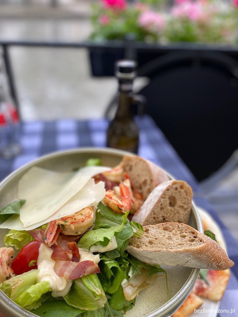 Sałatę Caesar z grillowanymi, jędrnymi i dużymi krewetkami (46 PLN), koktajlowymi pomidorkami, plastrami Grana Padano i pieczywem potraktowano przeogromną ilością sosu na bazie anchois – wystarczyłoby go na co najmniej trzy takie sałaty! W głębokim talerzu znajdowała się również podsmażona pancetta czyli dojrzewający boczek. Danie nie porwało i raczej nie jest warte powtórzenia.
