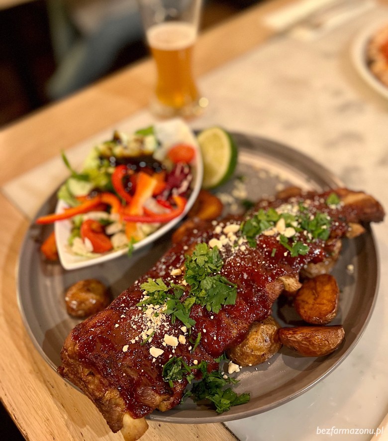 Wieprzowe żeberko w gęstym, odrobinę dymnym sosie BBQ (59 PLN) odchodziło od kostki i dobrze smakowało. Nie był to sam tłuszcz, lecz również i proteiny. W zestawie opiekane ziemniaki oraz kompozycja sałat. Kostki zostały obgryzione do zera, dodatki również zniknęły z talerza. Cena jak na żebra nie najmniejsza, myślę że znajdą się miejsca gdzie podobne da się wyrwać za 2/3 tej kwoty.