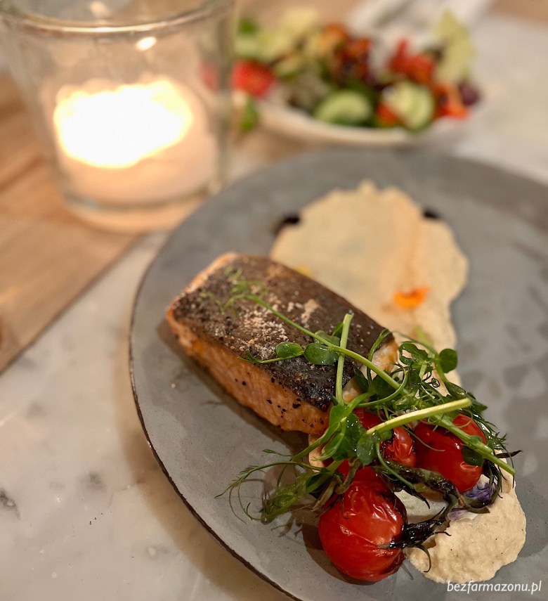 Pieczony łosoś (52 PLN) okey, lecz to puree z pieczonego kalafiora zaskoczyło niebanalnym smakiem. Przed K. wylądowała również kompozycja sałat, a warto zauważyć iż takowa nie jest wymieniona jako suplement do tego dania.