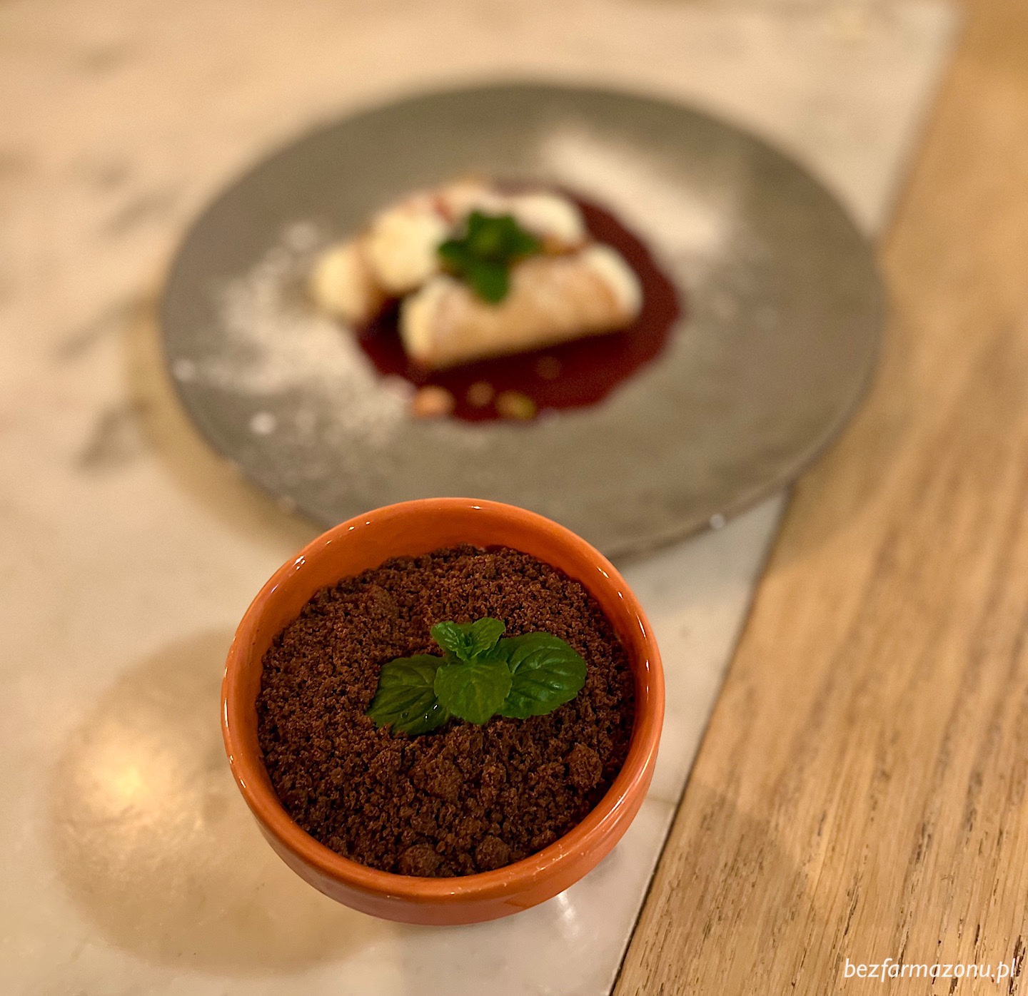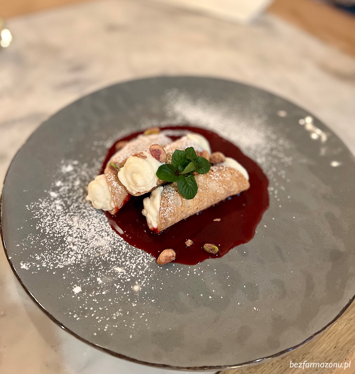 Skończyliśmy na deserach. Canolli z kremem z ricotty i pistacjami (24 PLN), tiramisu (24 PLN) i… tatar wołowy (49 PLN). No co, nie każdy kończy kolację słodyczami 🙂