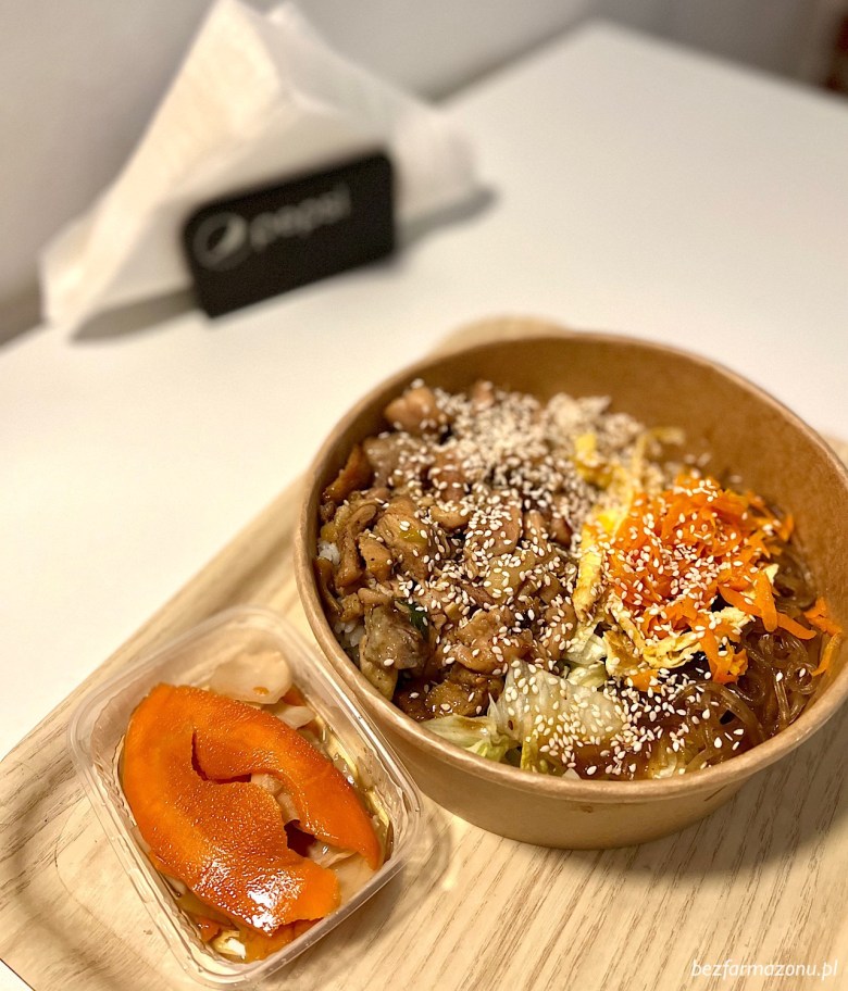 Poprosiłem o to samo co pół roku temu czyli Soy Chicken Cupbop (23 PLN), lecz tym razem zjadłem w lokalu, a nie w domu. Niestety przez wzgląd na zapachy smażonego oleju, konsumpcja w środku nie należy do najmilszych. Polecam zabrać strawę na wynos lub jeśli pozwala na to temperatura, zjeść przy stoliku na zewnątrz.