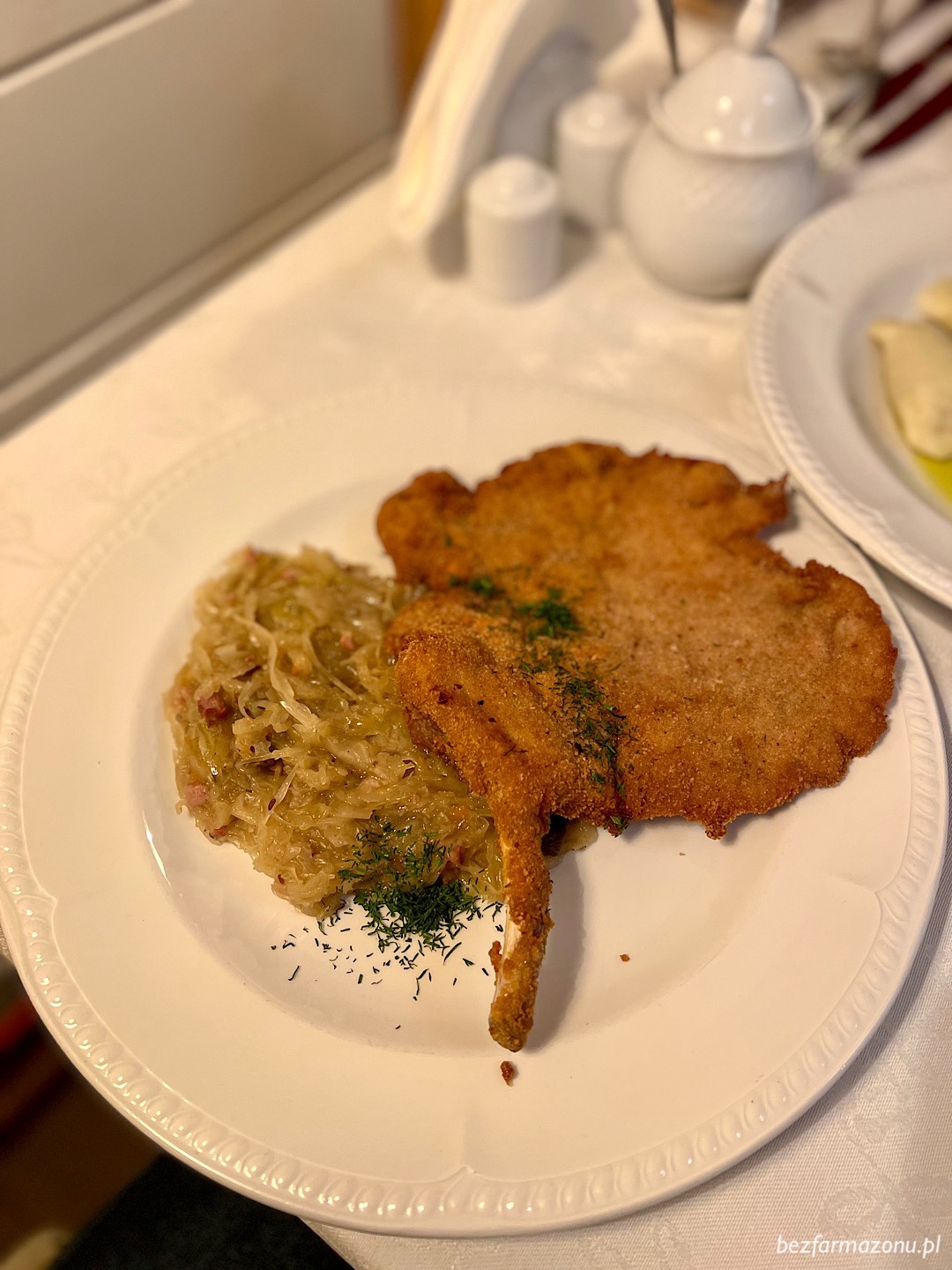 Schabowy z kością i kapustą zasmażaną (52 PLN) był najlepszym kawałkiem panierowanego mięcha jakie jadłem ostatnimi czasy. Cienki, świetnie ubity, przepyszny i oczywiście smażony na smalcu. Obgryziony do samiutkiej kostki. Kapucha również na plus. Tylko… jeśli chcecie jakieś węglowodany to musicie je sobie dokupić – ziemniaczki są za 16 złotych, eh