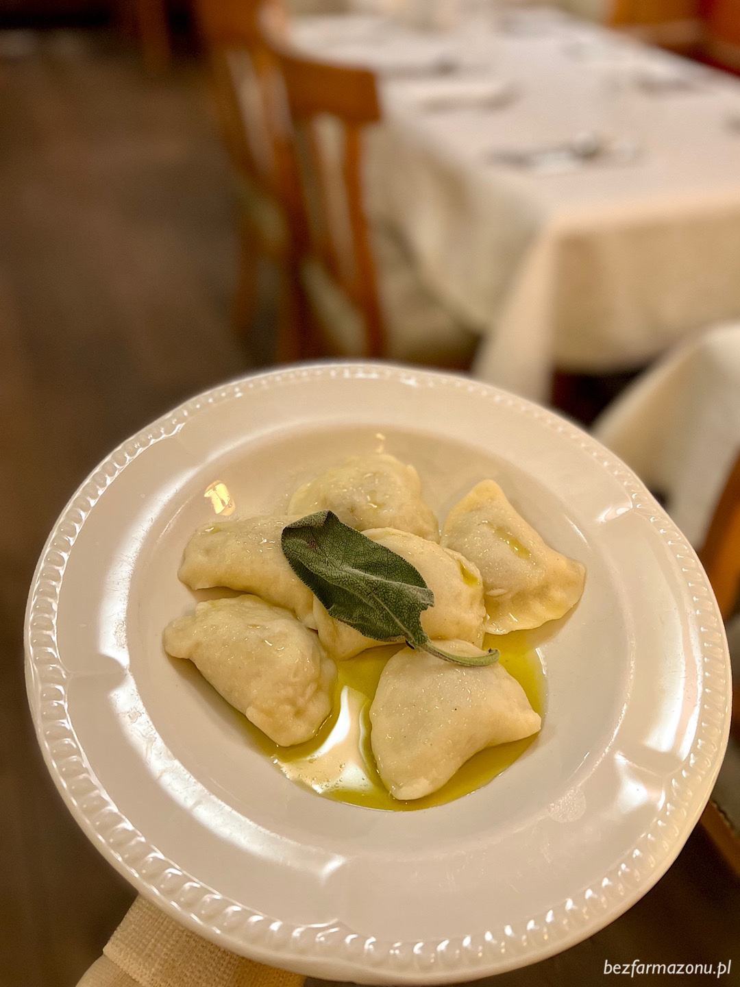 Pierogi z cielęciną z konkretną ilością masła i listkiem szałwii (44 PLN) podeszły mi średnio. Treść miały dobrą, ale nie do końca przekonało mnie grube i zbyt miękkie (takie jakby rozlazłe) ciasto. Na pewno nie były to świeżo lepione okazy.