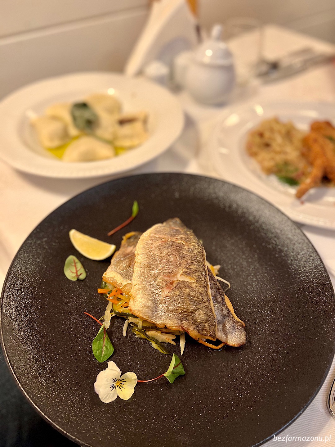 Okoń morski pieczony w papilocie z pieczonymi warzywami (64 PLN) równie perfekcyjny jak wcześniejsza wieprzowina. Lekki, soczysty, a warzywa sprężyste i pełne smaku (niektóre z nich uprzednio ugrillowane). Znowu bardzo dobre danie, ale facet tym nie poje.