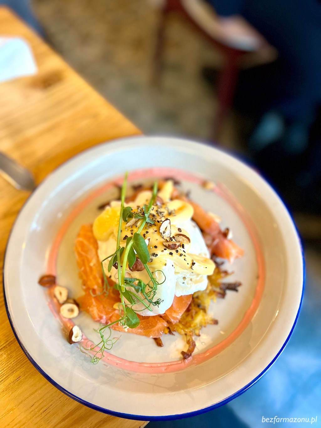 Rosty – cienkie, świeżo tarte, smażone placki z ziemniaków z super delikatnym, marynowanym łososiem, płynnymi jajkami oraz gęstym holenderskim sosem (34 PLN). Tu i ówdzie miotają się laskowe orzechy.