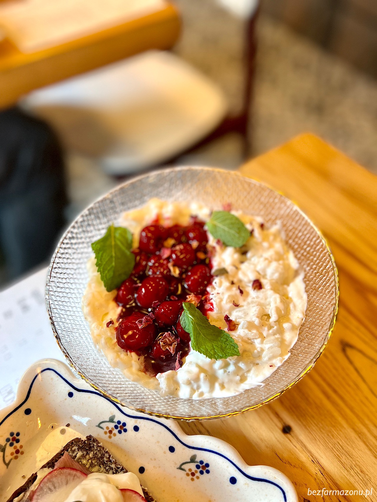 Risengrod (21 PLN) to nic innego jak ryż na mleku. Tutejszy pudding podaje się z wiśniami – danie ma bardzo wyważoną słodycz, przyjemny smak i dzięki wysokotłuszczowej śmietanie kremową konsystencję.