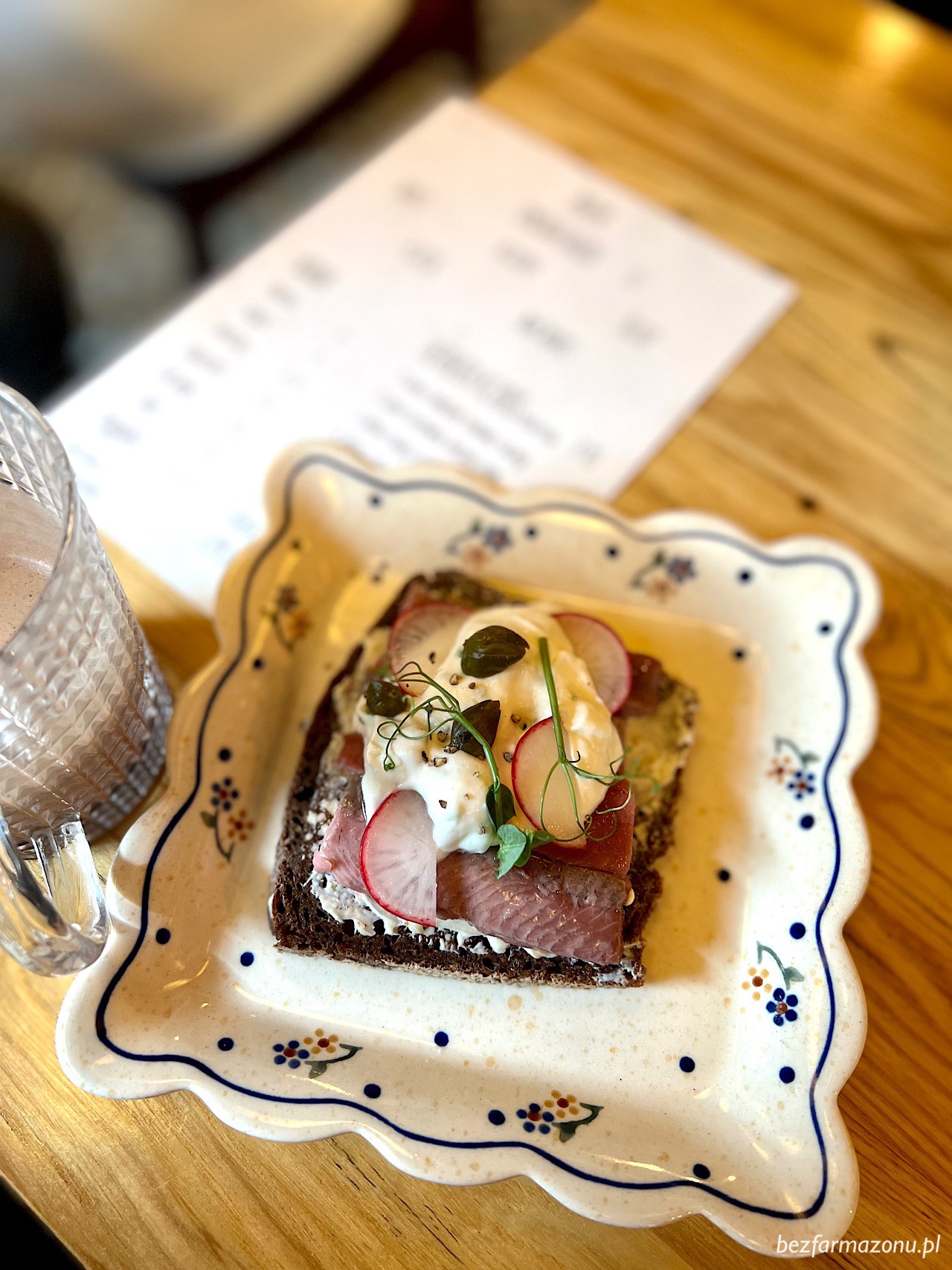 Na zdjęciu poniżej wersja z oryginalnym matjasem (czyli młodym śledziem, tzw. dziewiczym jeszcze przed tarłem), rzodkiewką i chrzanową śmietaną.