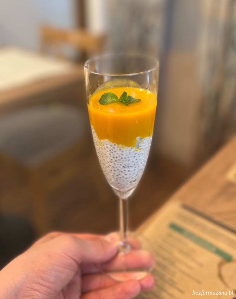 Pyszny obiad zakończyliśmy prostym, nieprzesłodzonym deserem w formie puddingu z moczonych w mleku nasion chia z musem mango.