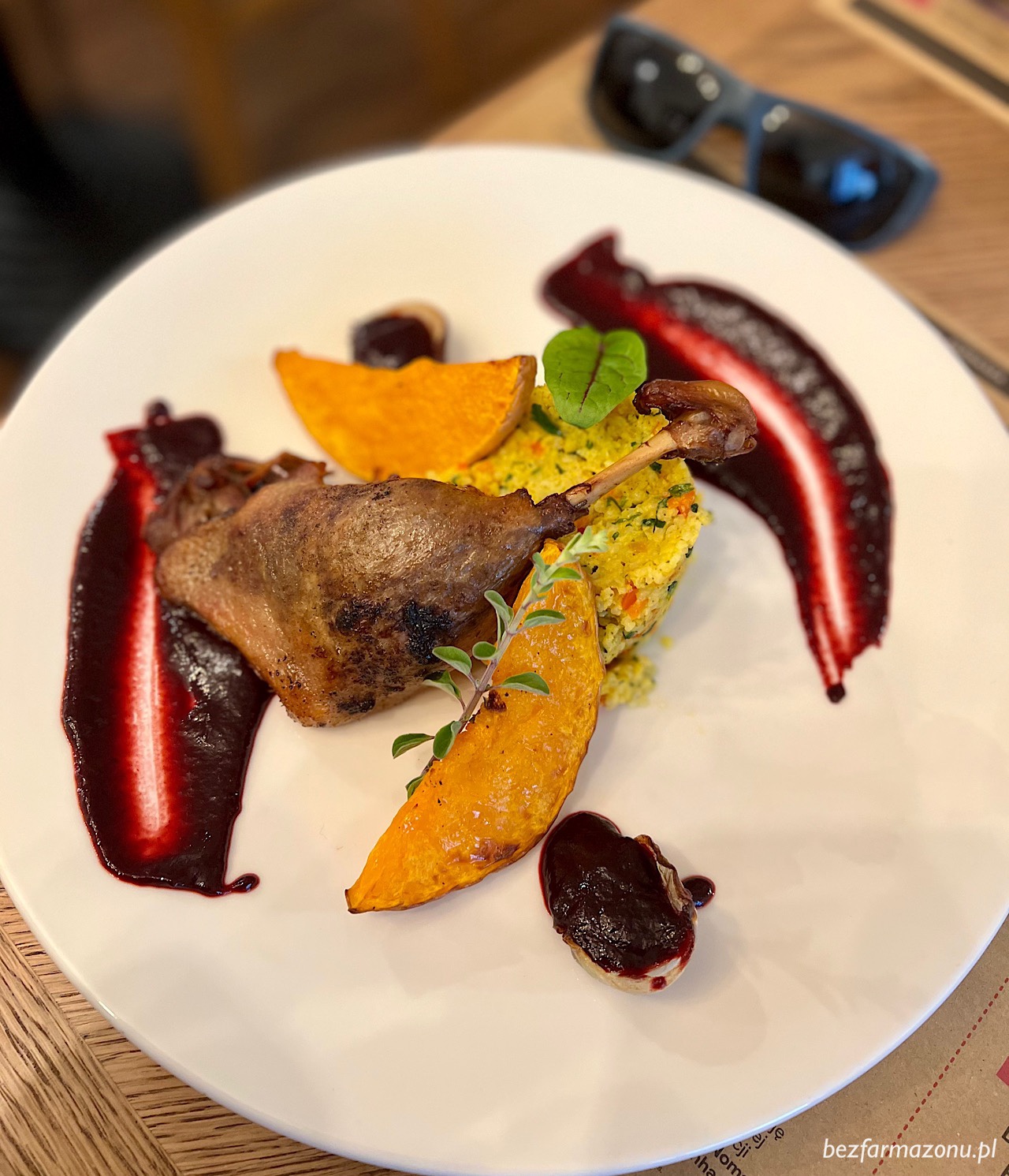 Pozycja mięsna w formie confitowanego, soczystego udka z kaczki podanego na aromatycznej jaglanej kaszy z pieczoną dynią i jeżynowym sosem to przykład polskiego dania z lekkim twistem.