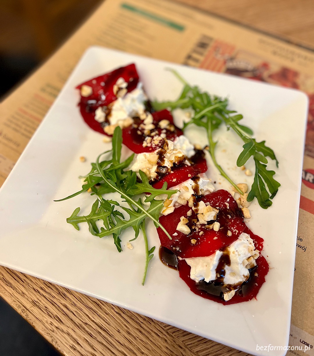 W pierwszej przystawce spodobał się nam super kremowy mus z koziego sera (espuma) wraz z delikatnie pieczonymi z dodatkiem rozmarynu plastrami buraka i orzechami nerkowca.
