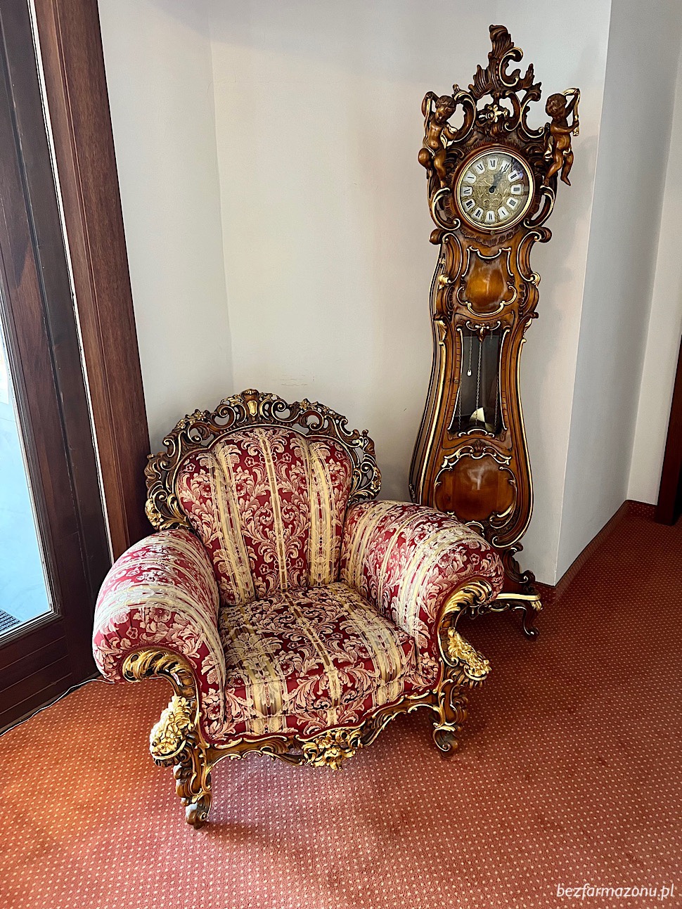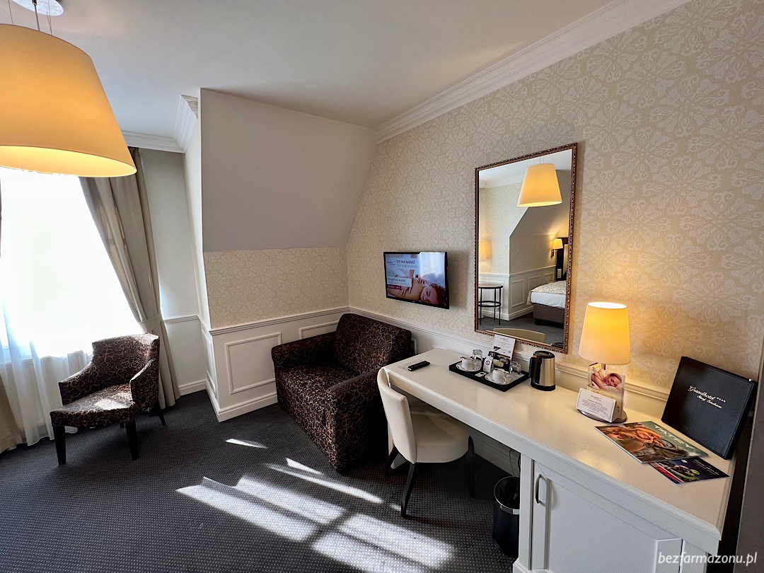 Pokój nie imponuje wymiarami, ale zawiera wszystko co potrzebne. Jest około 160 cm łóżko, zasłony pozwalające dobrze pospać, dwa fotele, stolik kawowy, ława i telewizor. W szafce minibarek, a w szafie w wejściu sejf.