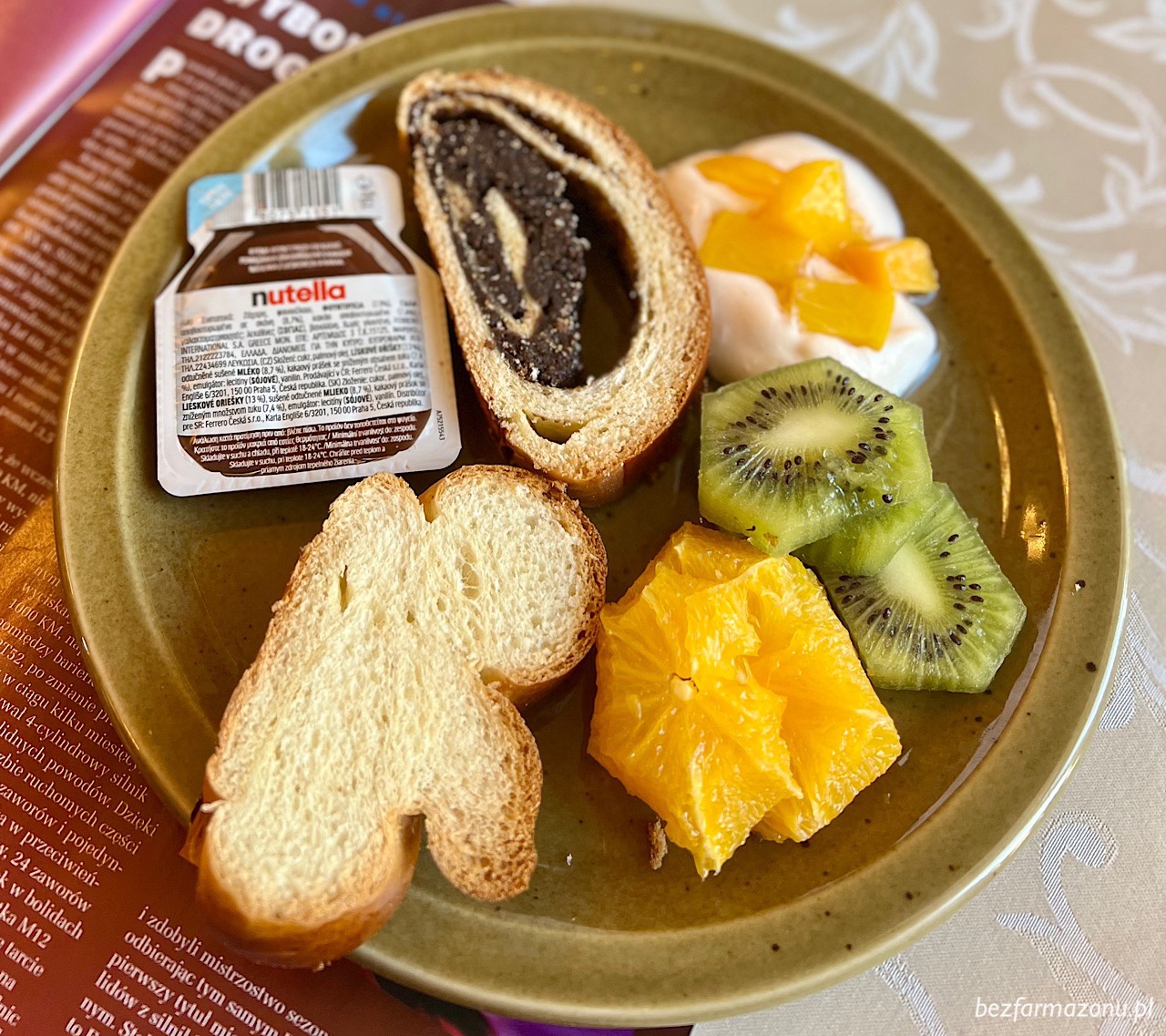Na minus należy zaliczyć bardzo słabej jakości pieczywo – zarówno chleby / bułki jak i te na słodko – croissanty i wypieki deserowe – w zdecydowanej większości paskudne mrożonki.