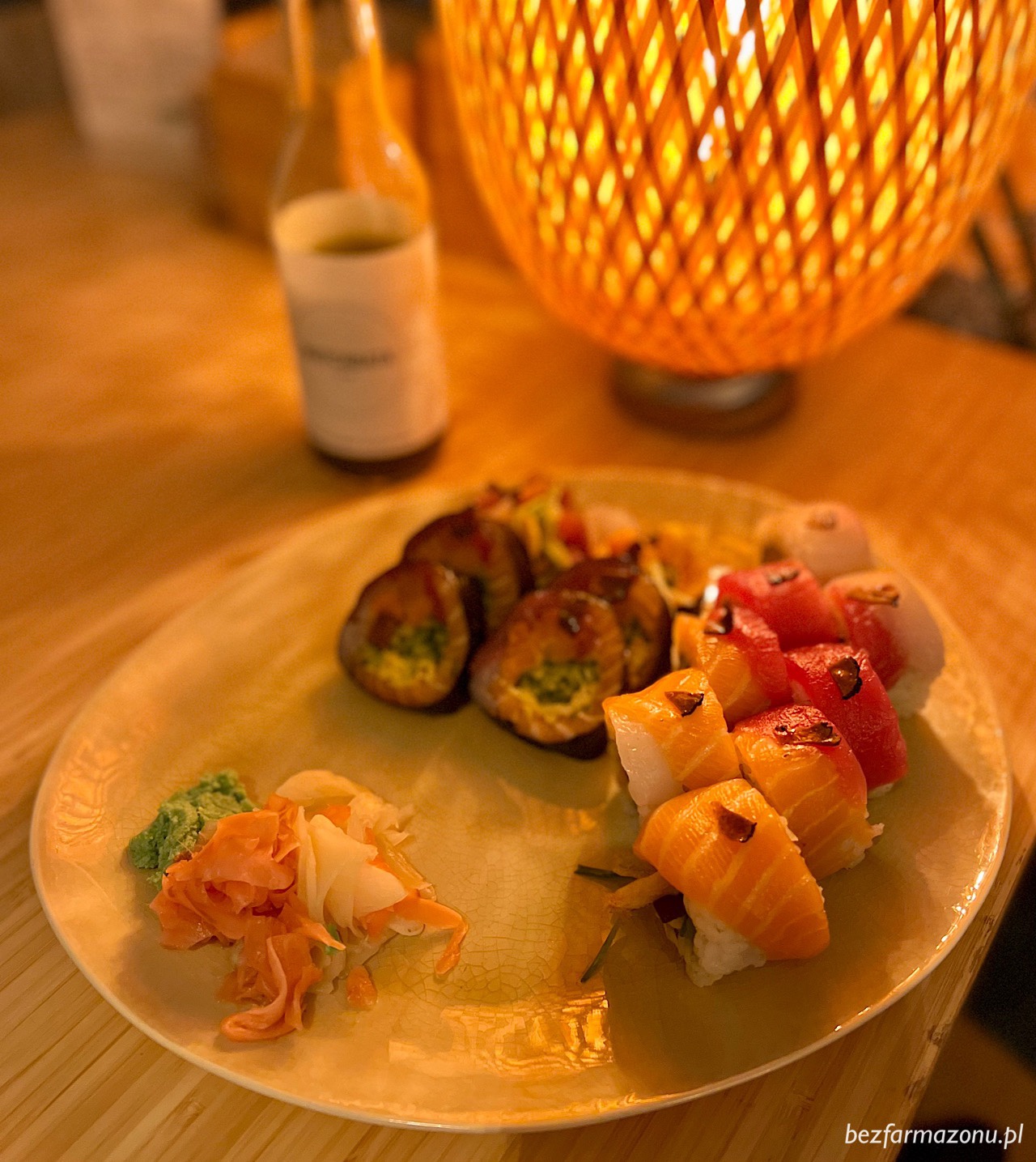 Sashimi roll (44 PLN) to rybne trio: łosoś, dorada i tuńczyk z warzywami i batatem w tempurze. Rolki Rainbow (40 PLN) owinięte są tymi samymi rybami.