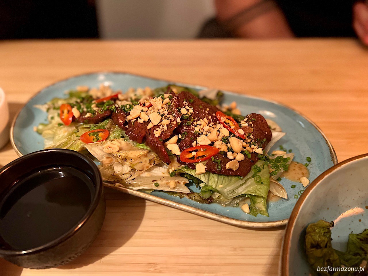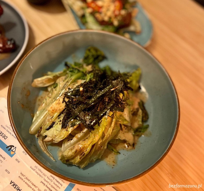 Sałata rzymska (17 PLN) z nori, mimo kremowego sezamowego dressingu atakowała zmysły głównie dymem.