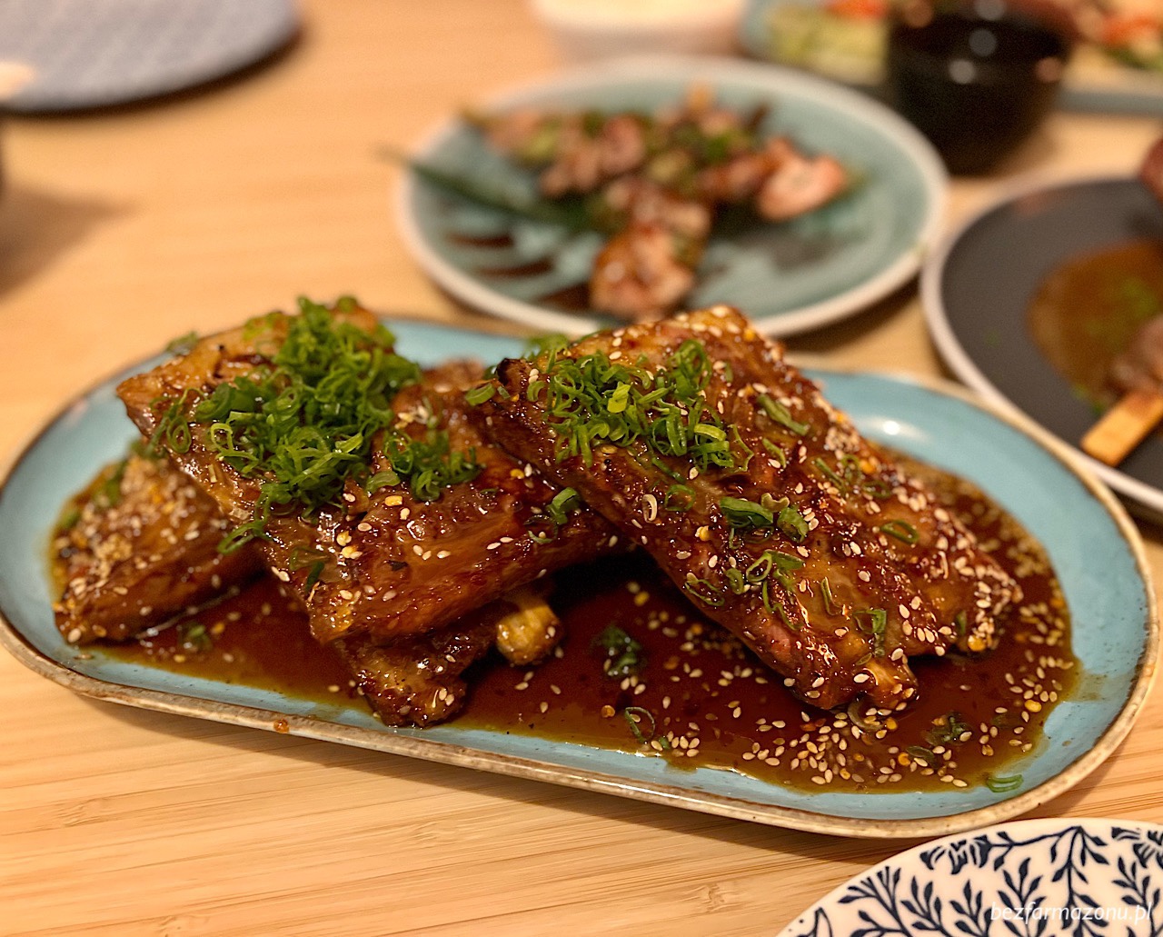 - koreańskie grillowane żeberka wieprzowe w słodko – pikantnej glazurze z sezamem i szczypiorem (27 PLN)