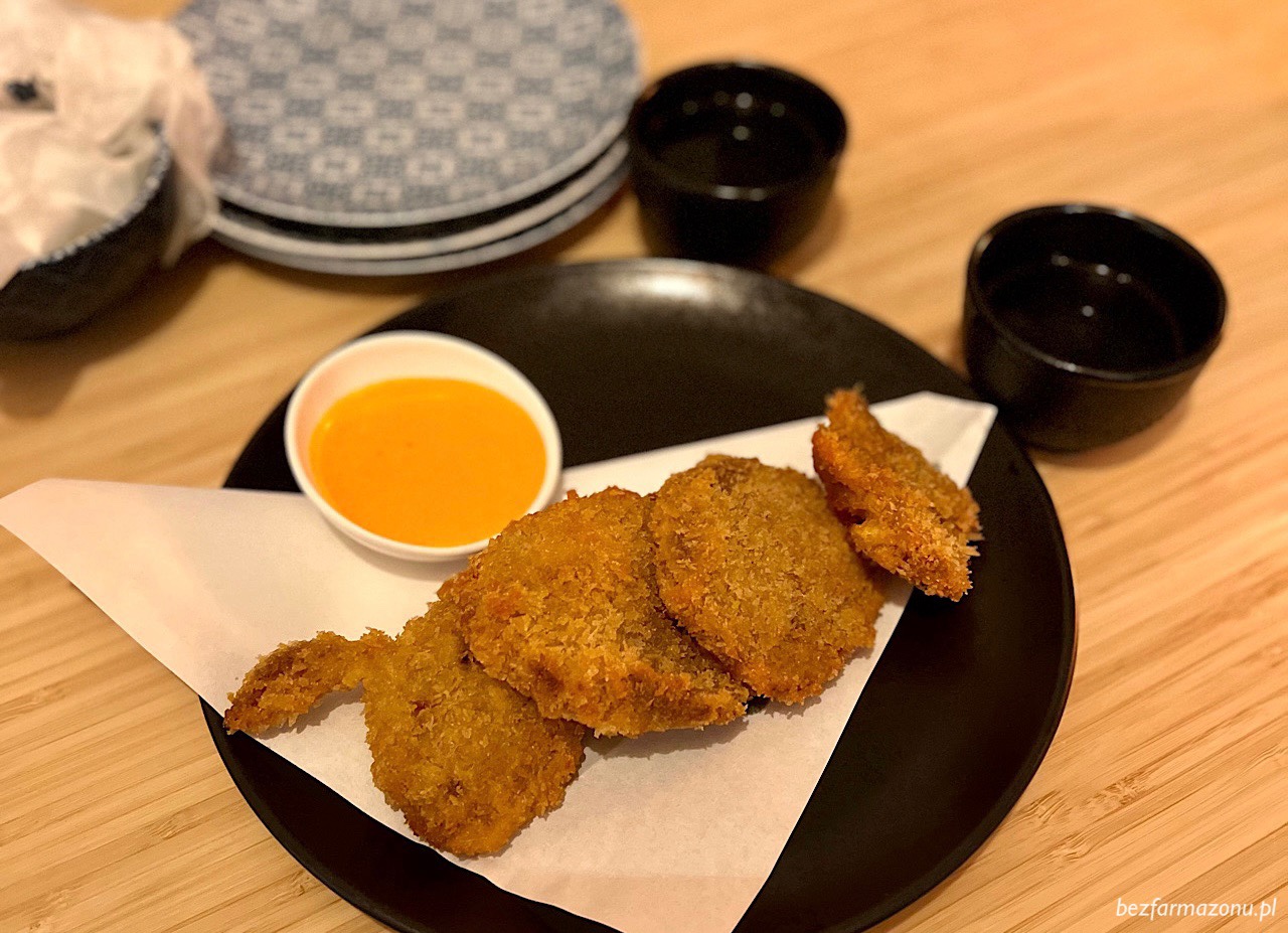 - 5 sztuk jędrnych krewetek w cienkiej, chrupiącej, nietłustej i ciepłej panko (25 PLN) z lekko pikantnym sosem mayo.