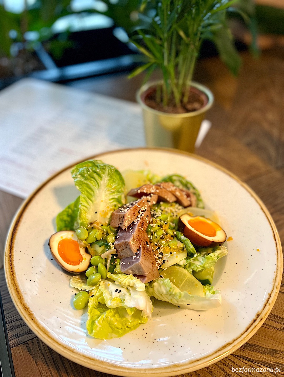 Najbardziej fit daniem była sałatka z tuńczykiem przygotowanym metodą tataki (błyskawiczne obsmażenie ryby na zewnątrz, tak aby środek pozostał wciąż soczysty). Sałata rzymska z daikonem, świeżym ogórkiem oraz edamame skąpane były w słodkawo – kwaskowatym majonezie yuzu. Całości dopełniało marynowane jajko oraz sezamowa posypka.