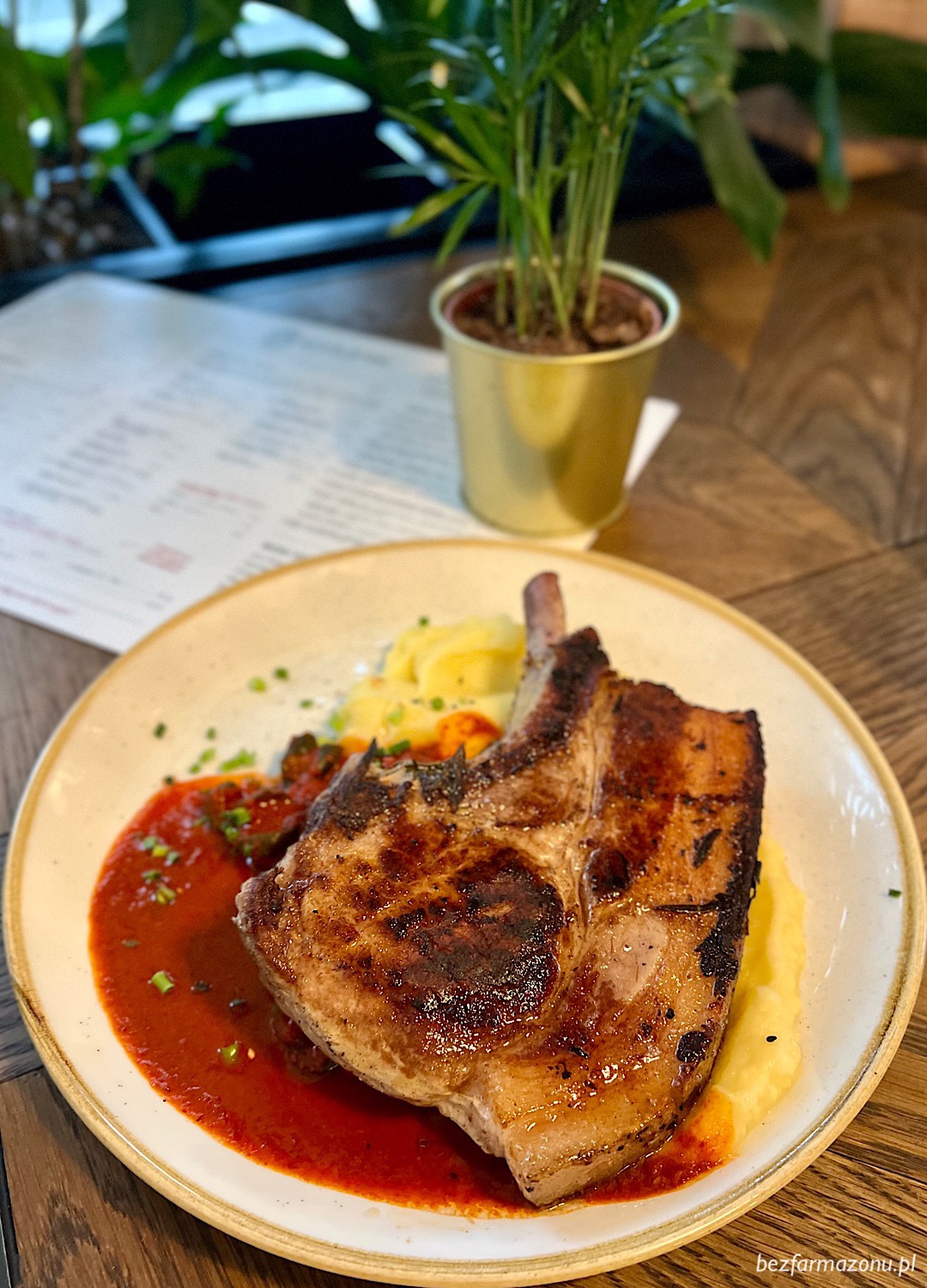 Świnia Duroc to pochodząca z USA rasa charakteryzująca się niskim otłuszczeniem i sporą zawartością mięsa. A tak wygląda stek tomahawk (73 PLN) z takiegoż właśnie okazu. Solidny kawał turbosmacznej wałówki spoczywał na maślanym ziemniaczanym puree, a towarzyszyły mu pikantne ogórki po koreańsku.