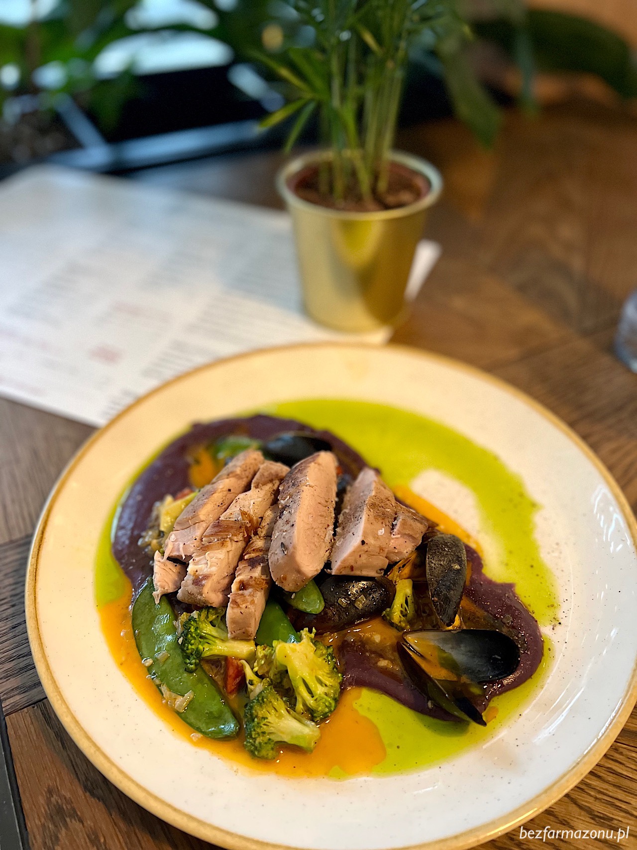 Ja obrałem kierunek portugalski i poprosiłem polędwiczkę wieprzową z małżami (59 PLN). Delikatne mięso ułożono na musie z fioletowych batatów, a akompaniowały im sprężyste zielone warzywa z maślaną emulsją.