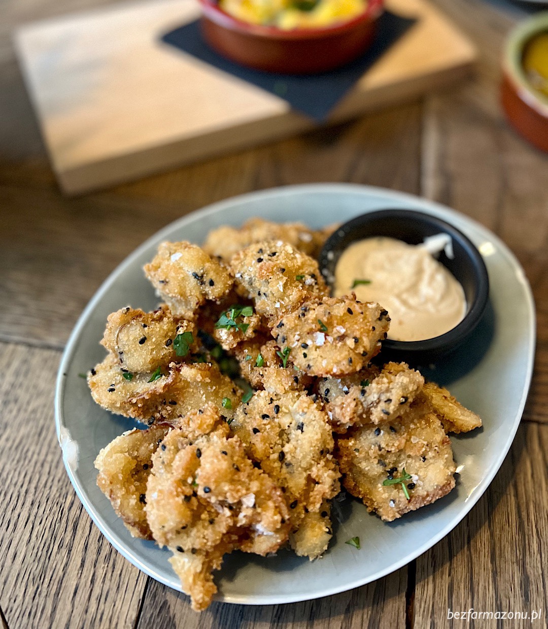 Boczniaki w panko z sezamem oraz majonezem z czarnego czosnku (17 PLN) okazały się zdecydowanie największą porcją warzyw w panierce jaką widzieliśmy w restauracjach w Krakowie. Otoczka nic a nic nie epatowała tłuszczem, a świetny sos radował podniebienia aż miło.