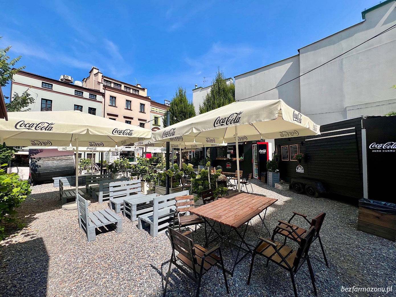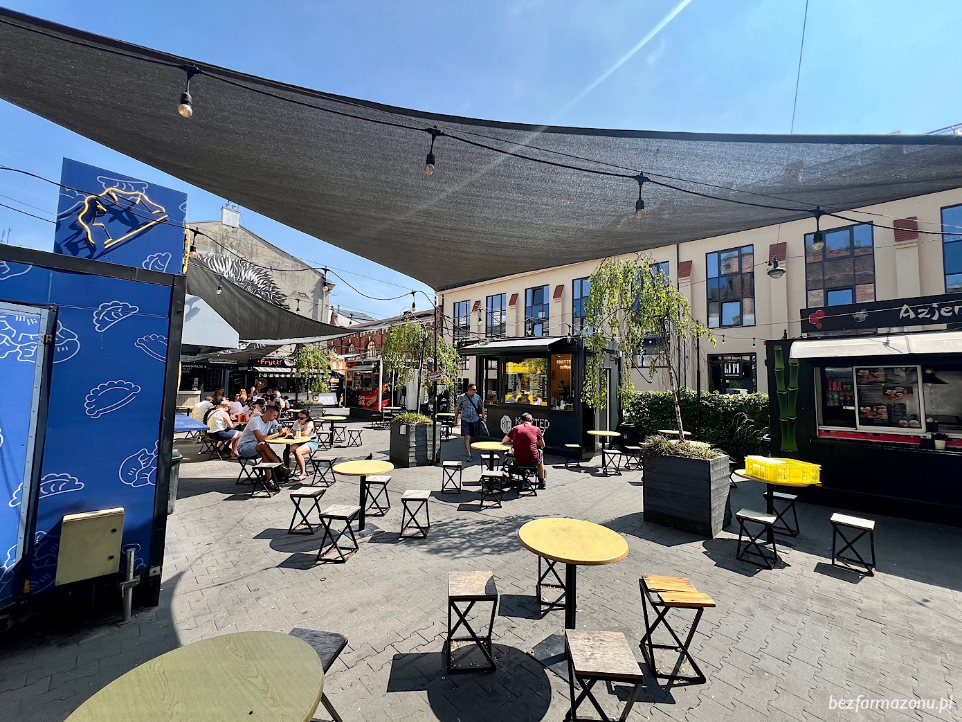 Miejscówka oddalona od Rynku dosłownie 7 minut na piechotę. W centrum placyku zadaszony bar z napojami alko i niealko, dookoła niego żarciowozy z przeróżnymi kuchniami świata.